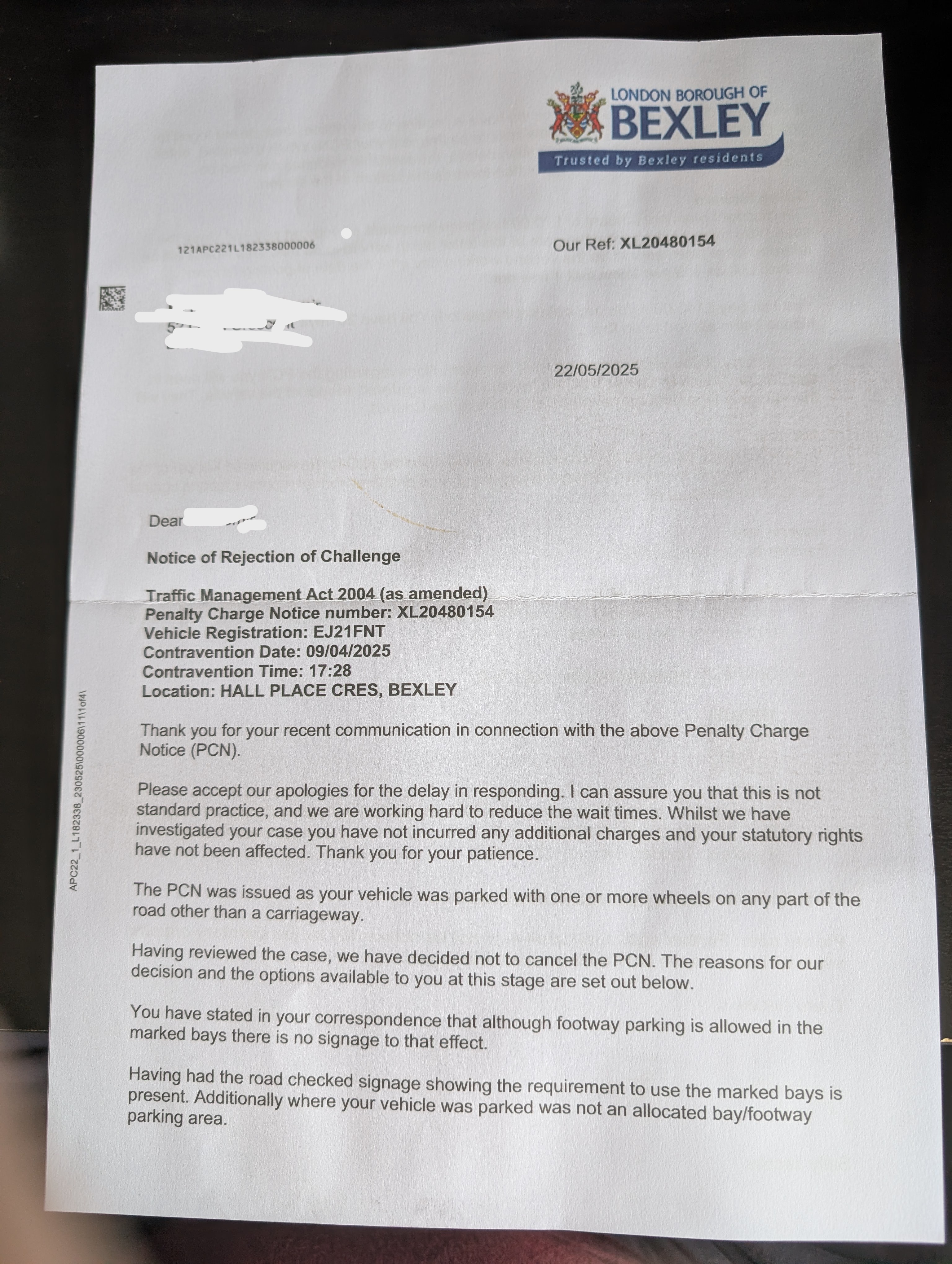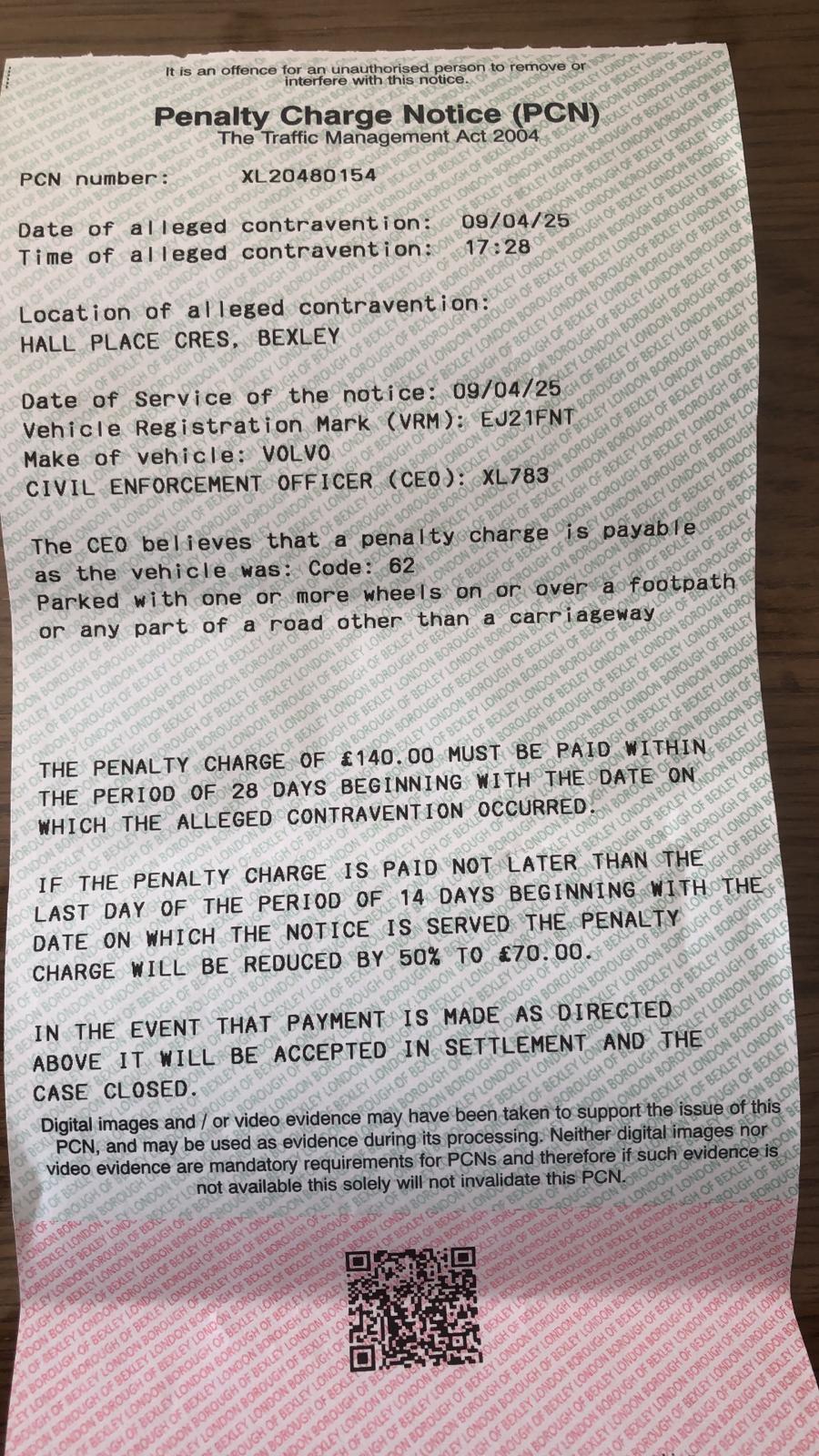 Re: Bexley, code 62 parked with one or more wheels on or over a footpath