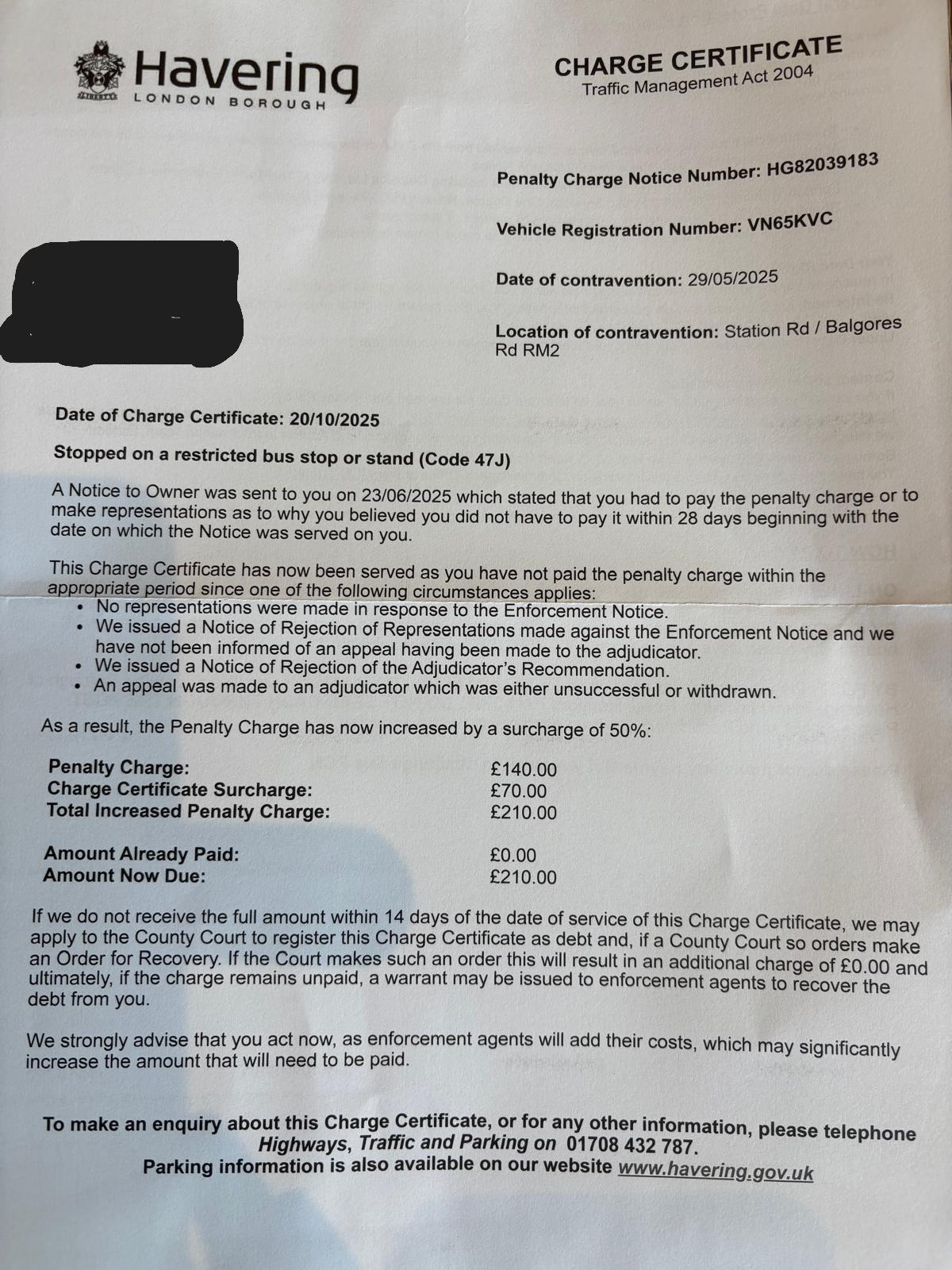 Four months later I received a letter saying the fine had increased from £140 to £210 as I hadn’t replied to the original letter. I called Havering council and they said I had to email, so I did that and got an auto reply saying they were busy and would be in touch, don’t contact us again. A further three months and I received another letter so emailed again, with the same response. Now they are threatening bailiffs and repossession, yet won’t answer emails or the phone. I am willing to pay the original fine, surely they can’t keep increasing it without responding to any of my correspondence?