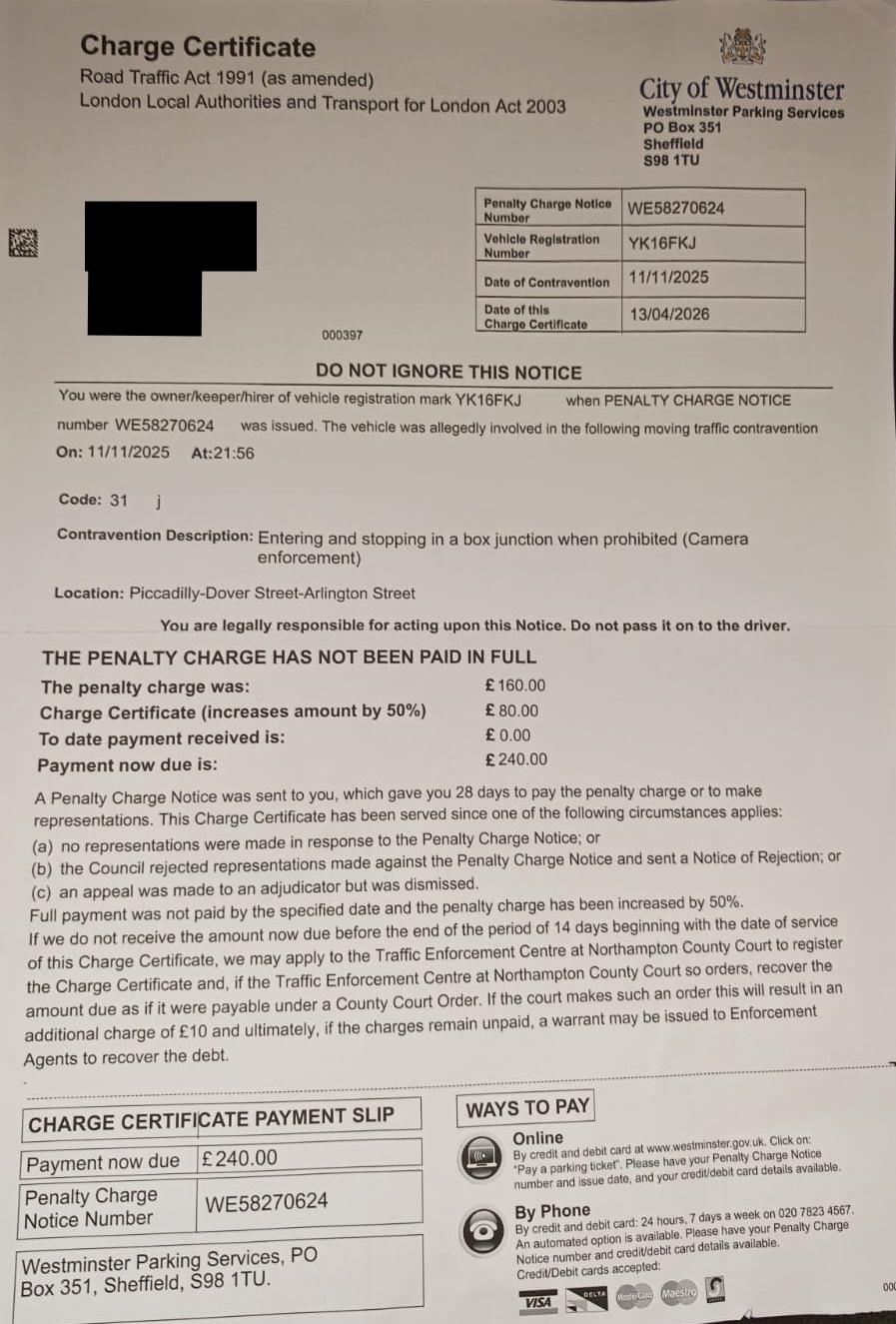 My issue with this is not so much the contravention on 11/11/2025 – but that this is the first I had heard of this. I received a letter (Charge Certificate) c. 16th/17th April (dated 13th April).