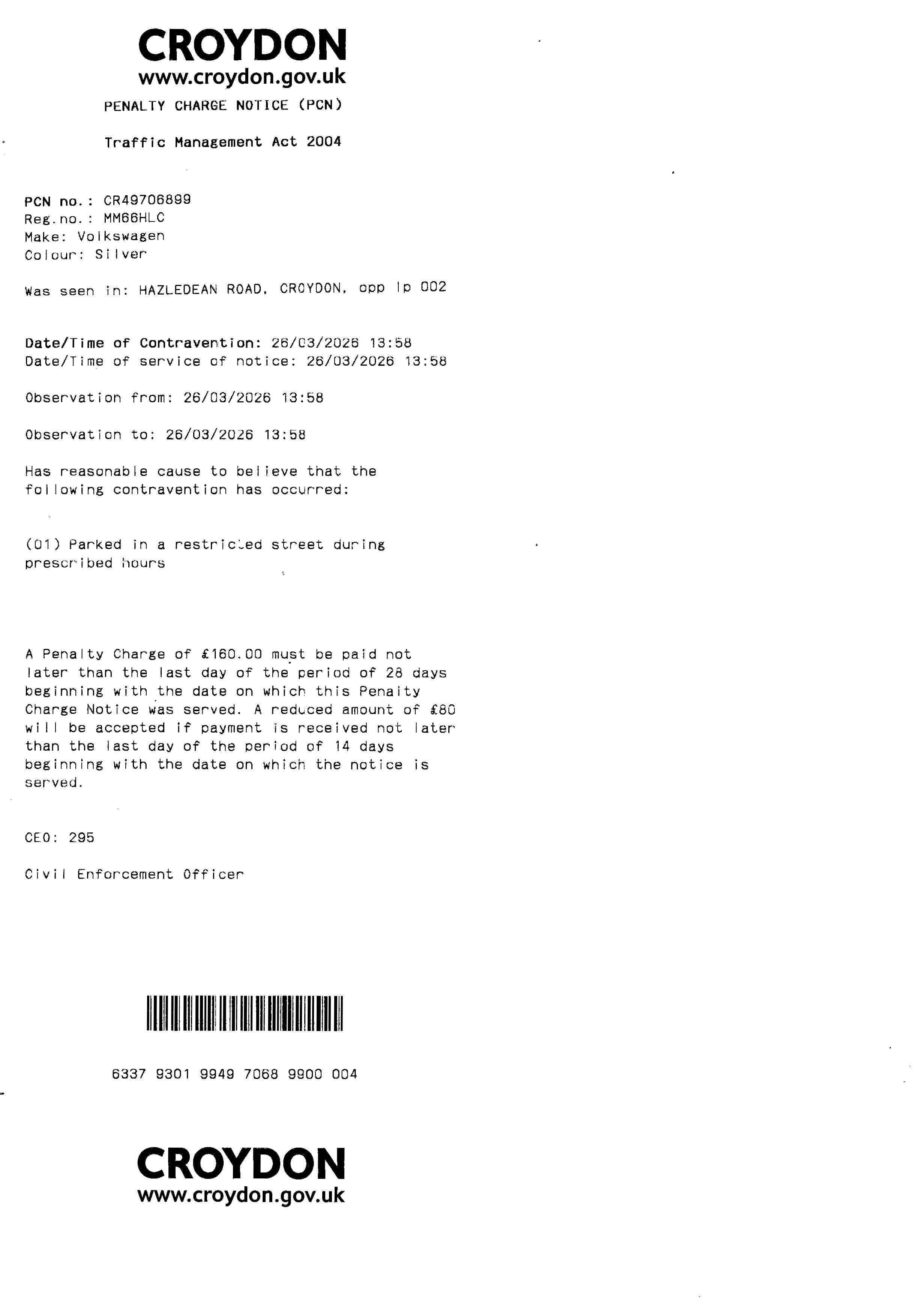 Croydon, Code 01 parked in a restricted street, Hazledan Road, Single Yellow Line, No NTO yet