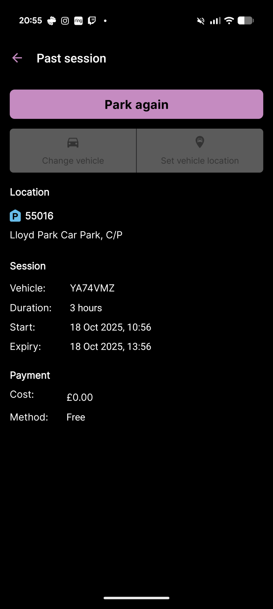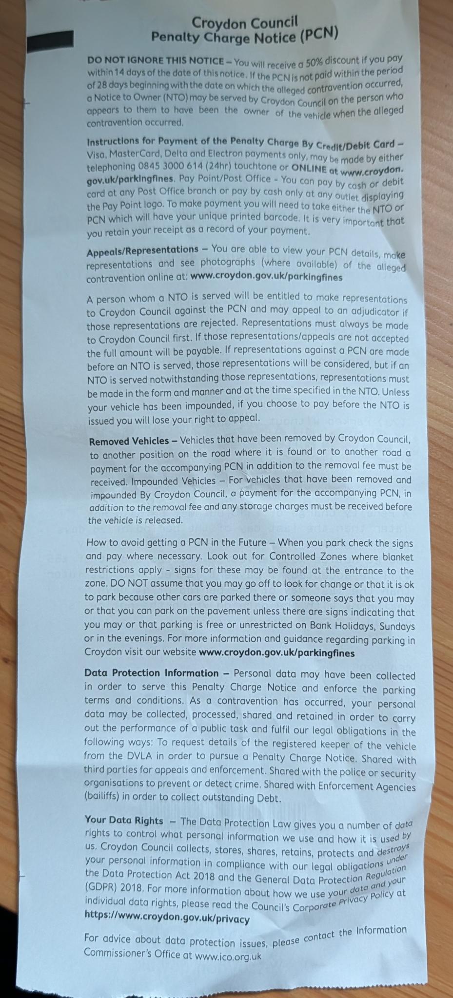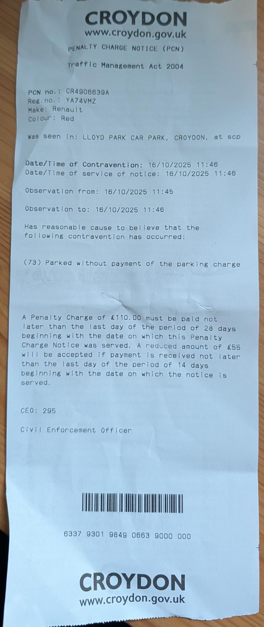 My wife recently visited the Lloyd Park Car Park in Croydon and totally forgot to use Ringgo to 'pay' for the 3 hours free parking. When she came back to the car, she had a Penalty Charge Notice issued with code 73 'parked without payment of the parking charge'. As she was staying longer for food at the café, she got worried she could get a second one so immediately registered the parking on Ringgo (at 12:33), PCN was issued at 11:46.