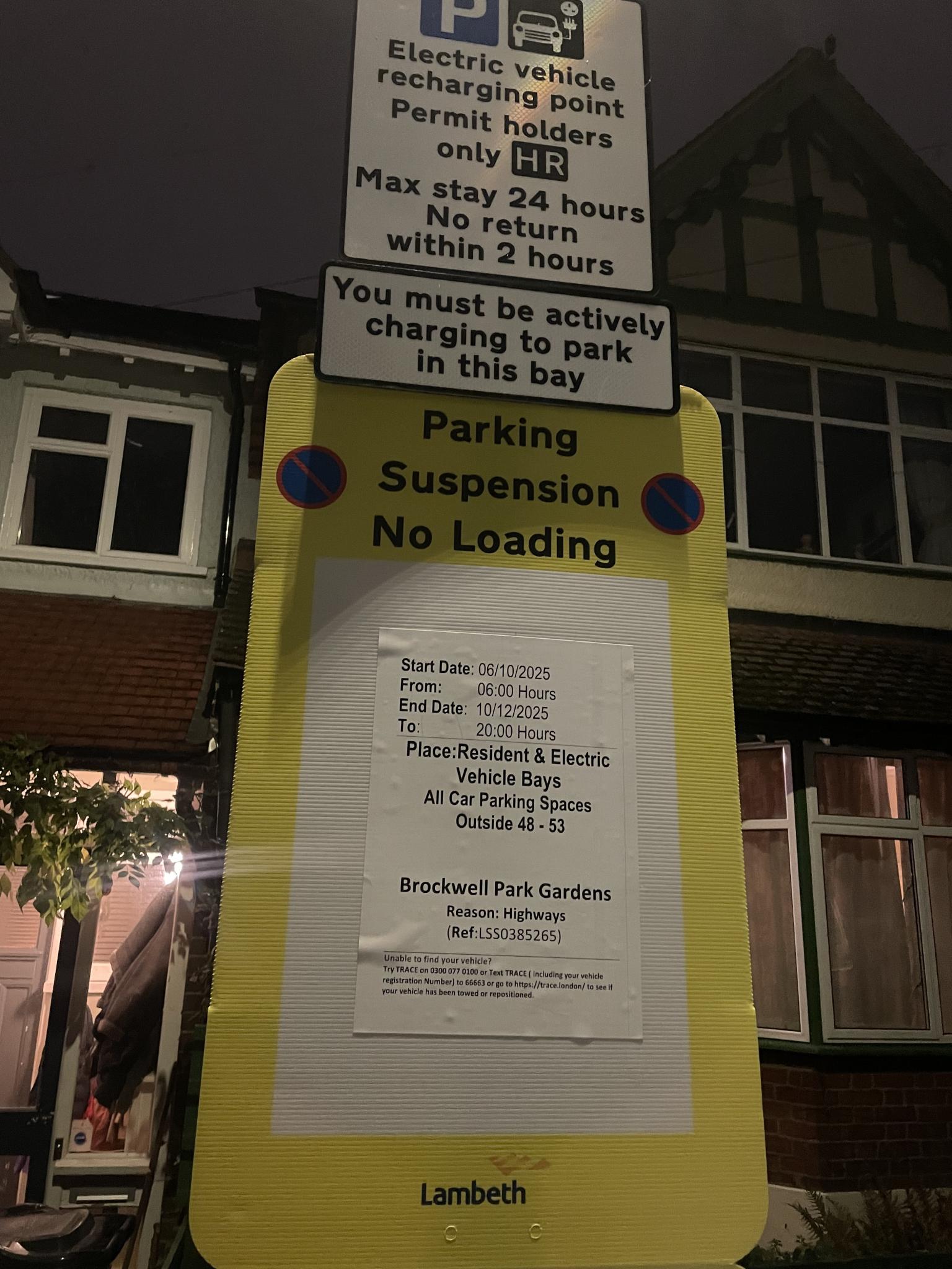 There have been roadworks (now complete and completely cleared) however there are suspended bay parking restrictions which we did not realise. We parked late on a Sunday arriving home with three children and didn’t realise that one space in the parking bay had a restriction. We do concede that the car was parked in a bay that was restricted.