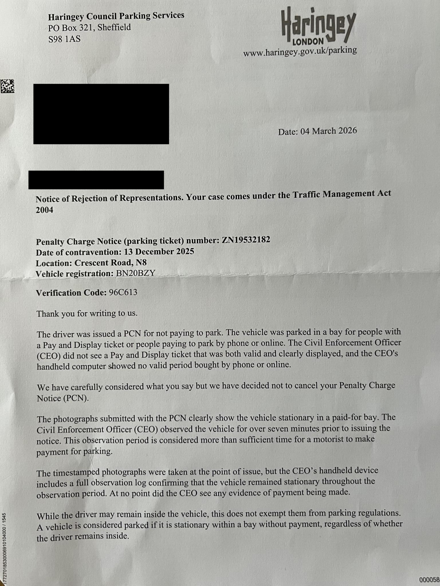 "None of the photographs submitted as evidence in this PCN show any evidence of parking. There is a car stopped in a bay, with no evidence of duration of stay. The driver is within their rights to observe local road rules, signs, and understand payment charges. Payment charges in Haringey as you know are handled via online applications, which take time to download, create accounts and register cars with. Please submit any evidence that this car was parked here longer than a judge would find reasonable to download a >100mb application, sign up for an account, register the vehicle, add payment methods for parking, find the correct parking zone, submit a request to park, find out the actual payment cost at this stage, and then to make a decision about whether to park. There is no evidence submitted suggesting the driver left the vehicle during this period. This PCN amounts to nothing more than harassment of the individual driving the vehicle and trying to understand the rules to park on this particular street, as there are 4 or 5 different zones within a <0.5mile radius."