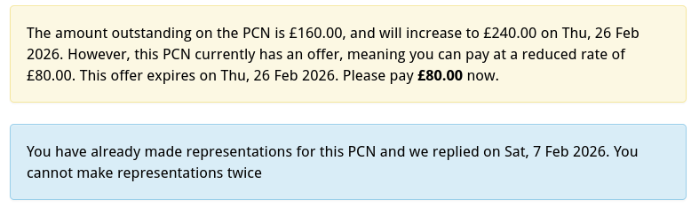 One thing possibly of interest is a message on the online portal, which suggests that the PCN will increase to £240 on the 26th Feb.