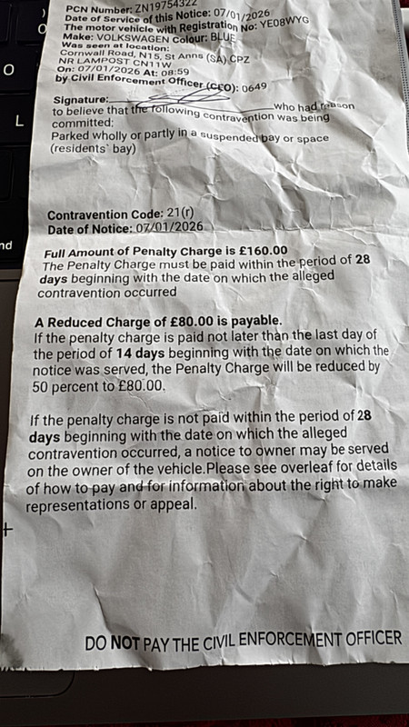 On 07/01/26, I received a PCN for parking in a bay that was temporarily suspended. I am resident so typically park on this road but a set of these bays were restricted due to temporary road works.