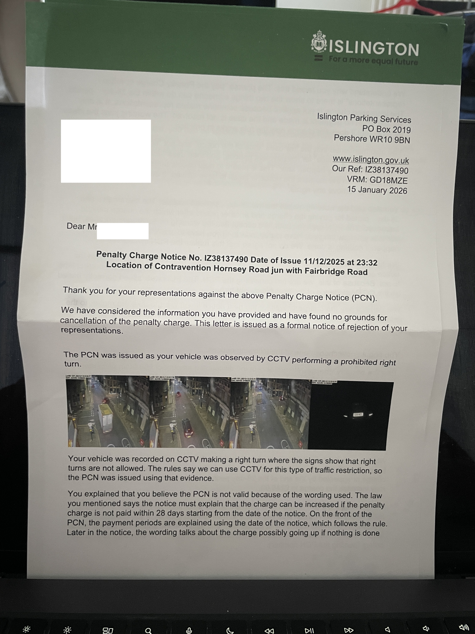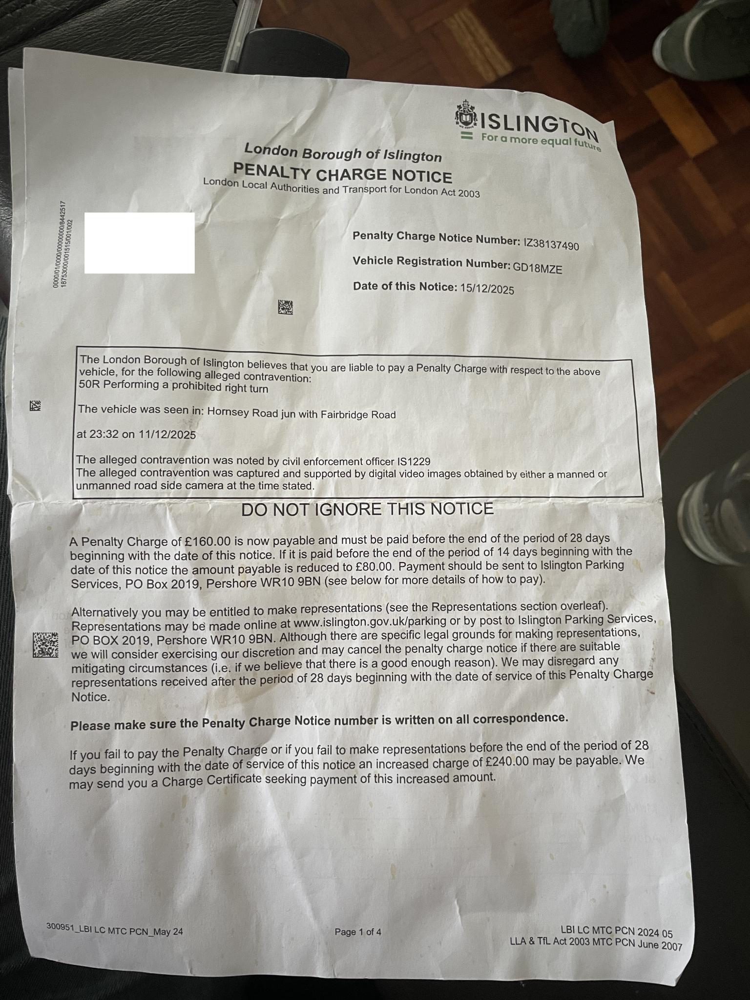 I received a PCN for a Prohibited Right Turn - Hornsey Road jun with Fairbridge Road: