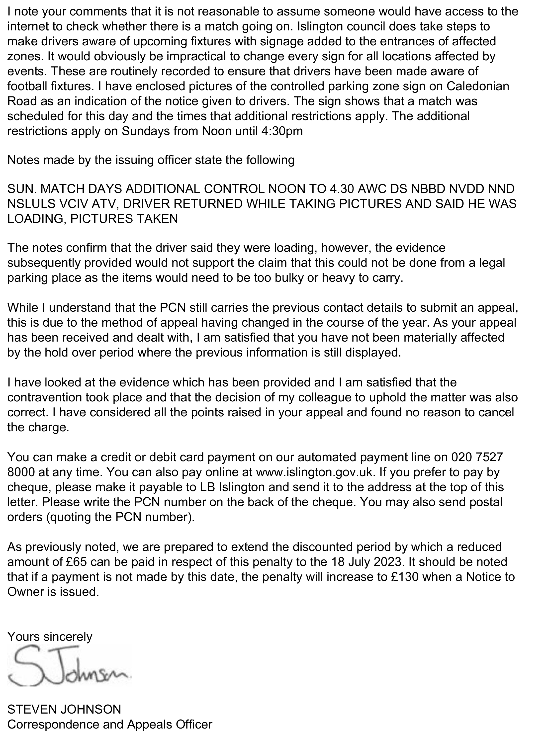- May 12, 2023: Submitted evidence, delayed due to the Islington PCN submission page being down. Provided a screenshot as proof. Fine increased to £130.