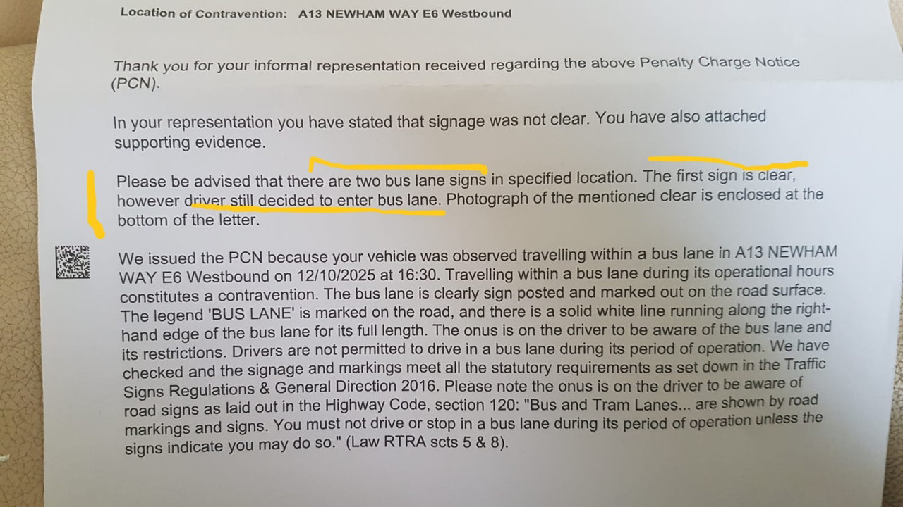 I received PCN for driving in bus lane at “A13 NEWHAM WAY E6 Westbound”