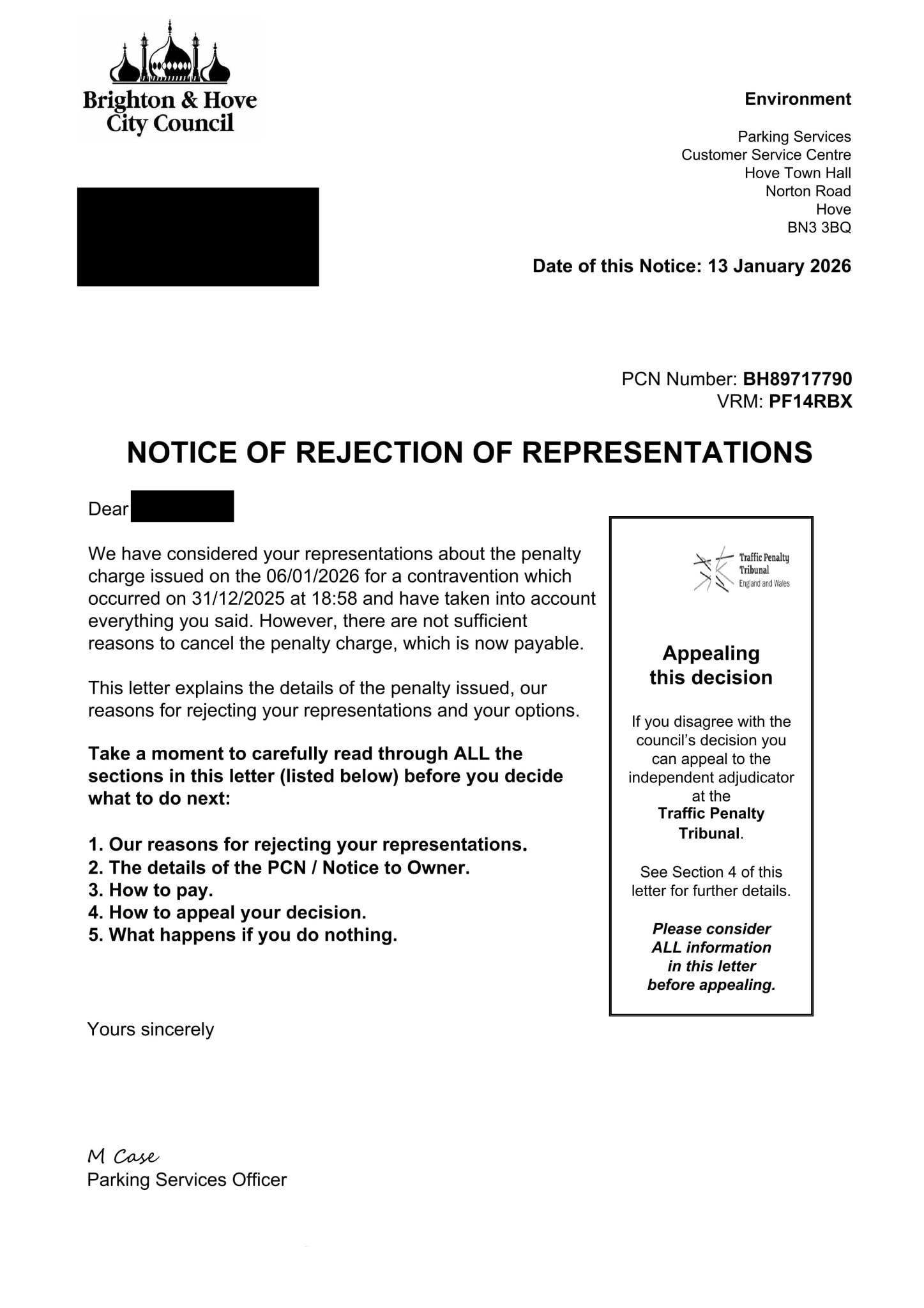 I initially submitted representations to the council soon after receipt of the PCN.  Unfortunately I seem to have fallen into the trap of making my reps a bit detail heavy and containing some minutiae that the council officer has used to reject the appeal off hand.  My reps as submitted verbatim to the council selecting the no contravention occurred option from the available grounds: