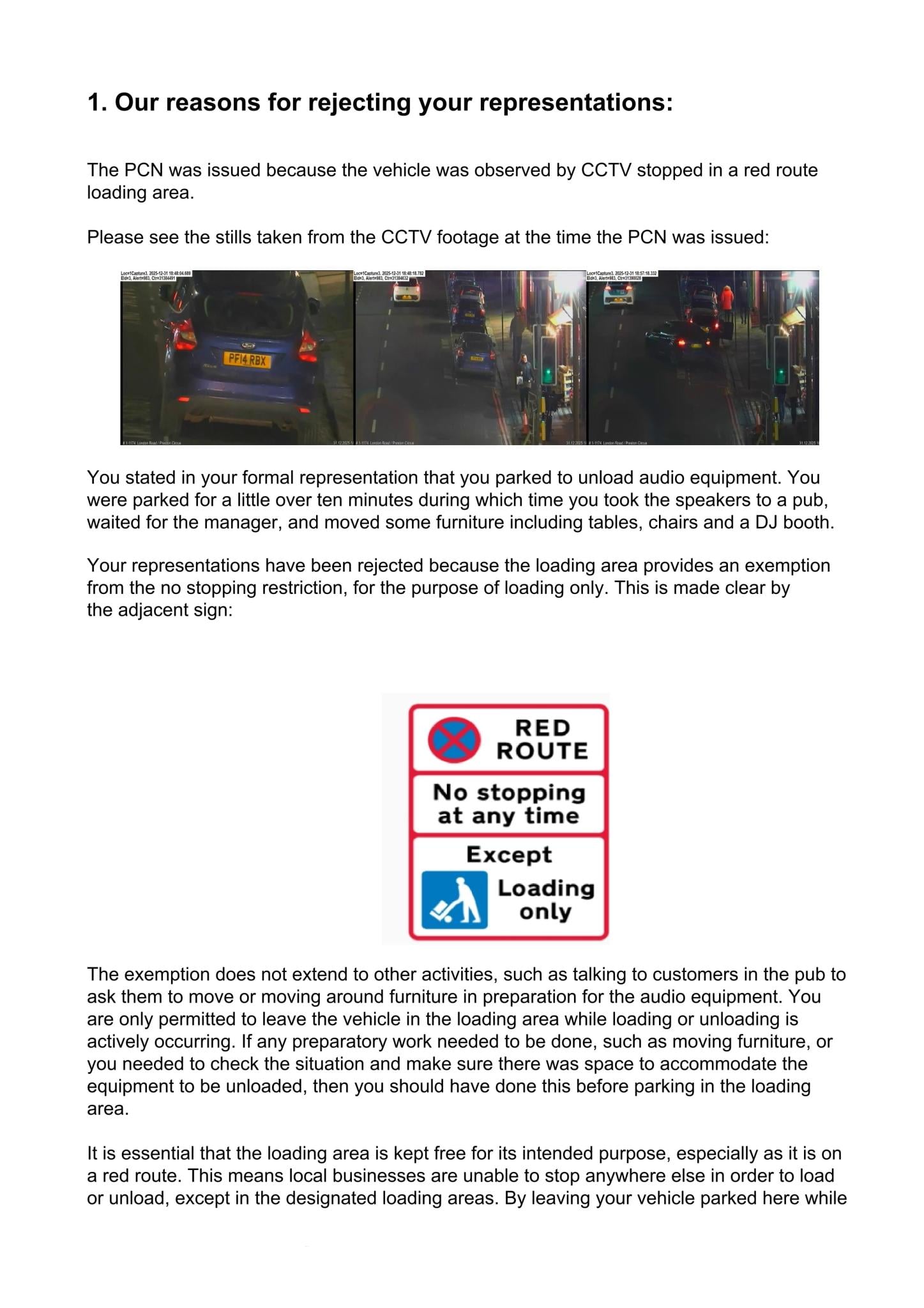 No contravention occurred due to exempt activity, specifically unloading/delivery of bulky/heavy audio equipment/ancillaries as partially captured by your own CCTV evidence. I had checked Google Maps prior and identified the loading bay on the right hand side of Preston Road that was close to the Joker pub as shown in the CCTV video. The unloading/delivery of the bulky/heavy speakers and connection accessories for them took only as long as necessary with my vehicle present in that bay for a little over 10 minutes for this purpose. This time period covered: