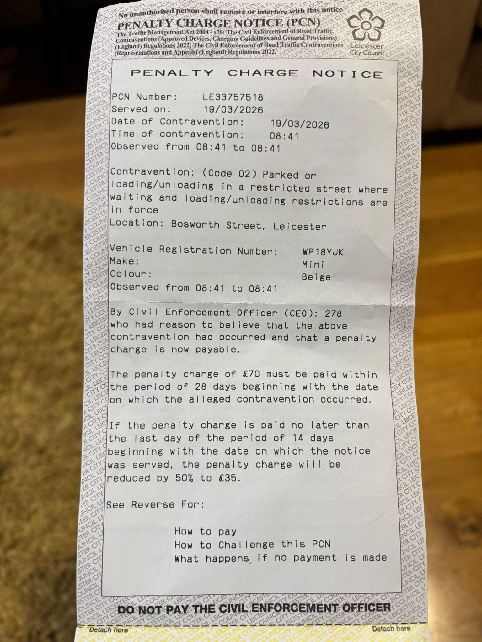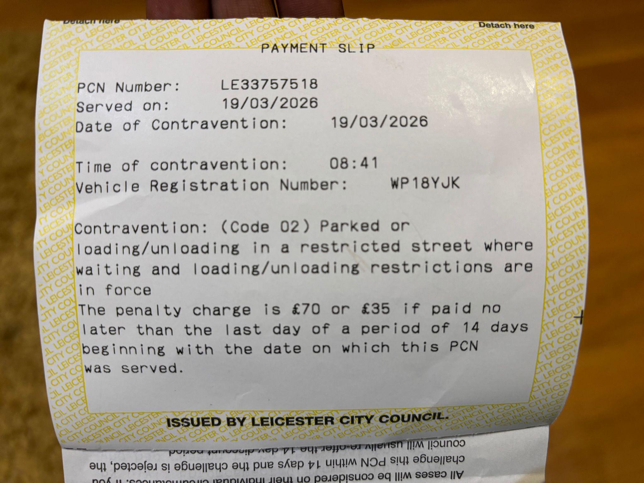 Hi I received a ticket today (20/03/26) from Leicester City Council that states Code 02 - Parked or loading/unloading in a restricted street where waiting and loading/unloading restrictions are in force.
