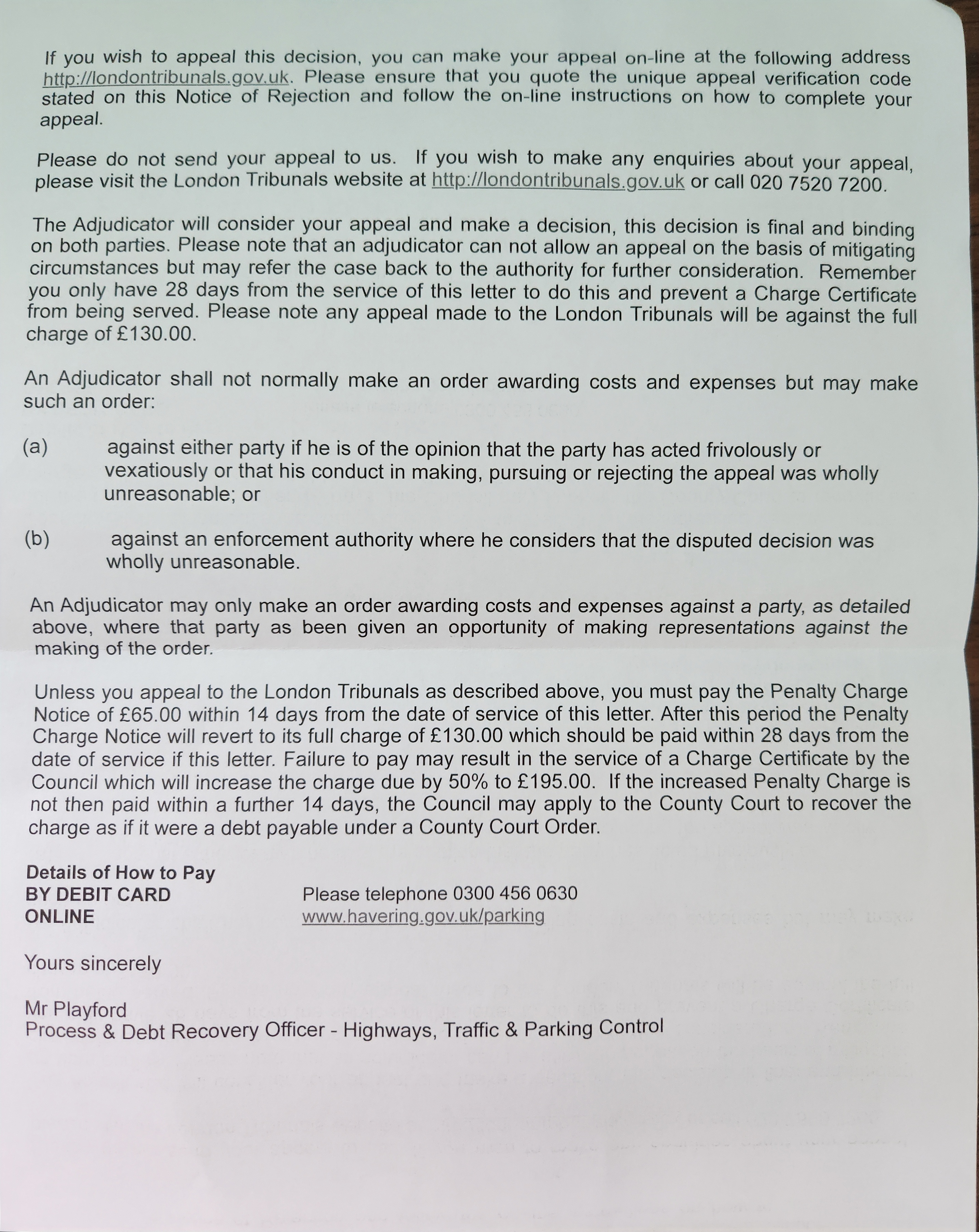 My challenge has been rejected. Here is the link to the letter from Havering Council