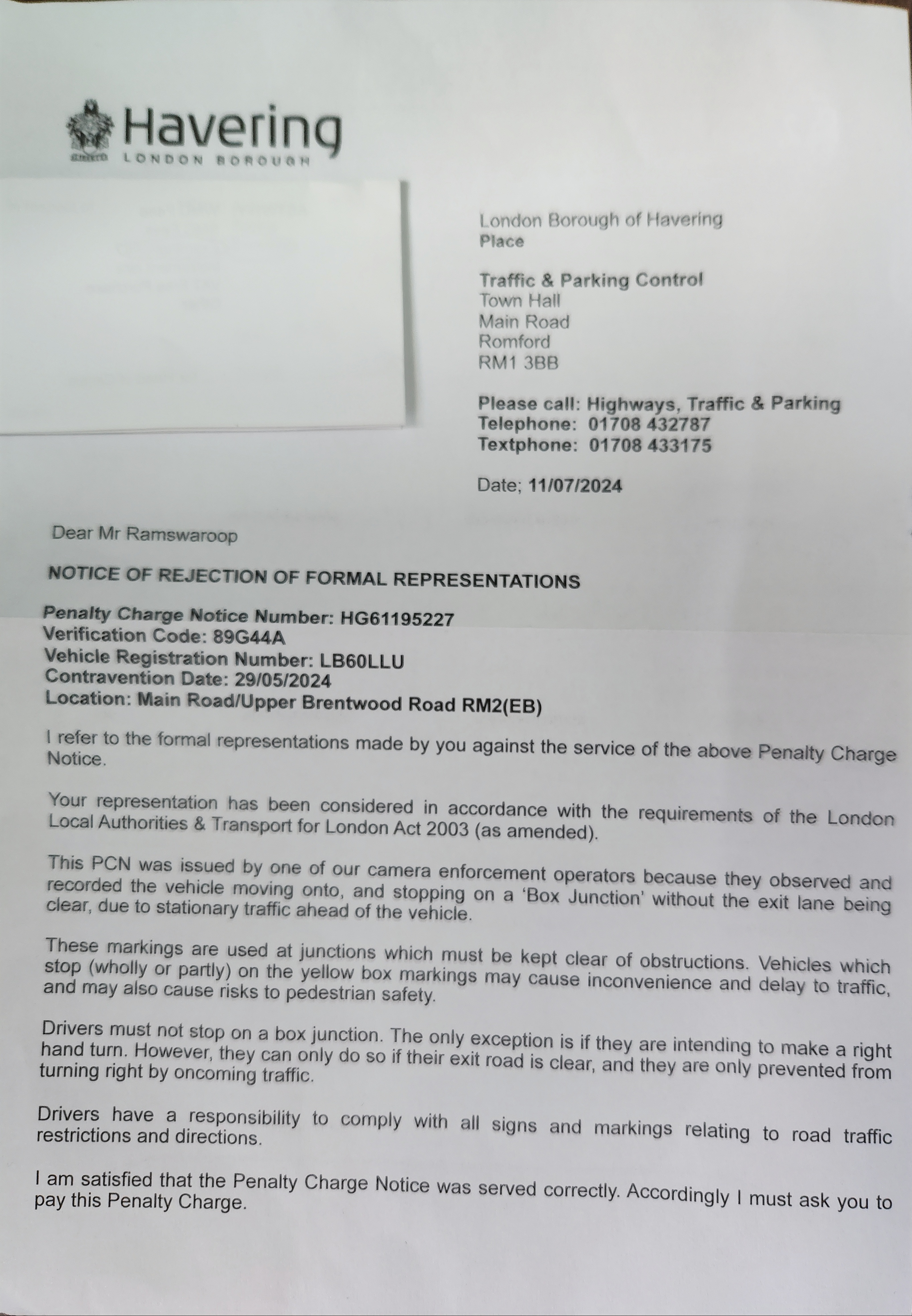 I am seeking some assistance and guidance regarding the PCN from the London borough of Havering for an alleged traffic contravention 31J: entering and stopping in a box junction when prohibited.