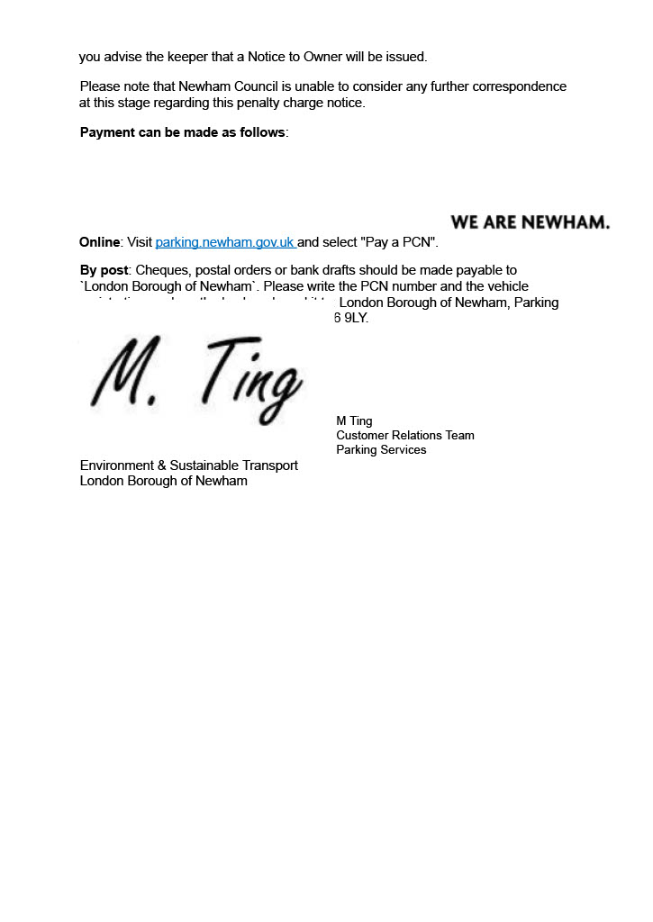 - That you are repeating your informal challenge that the contravention did not occur owing to inadequate signage.