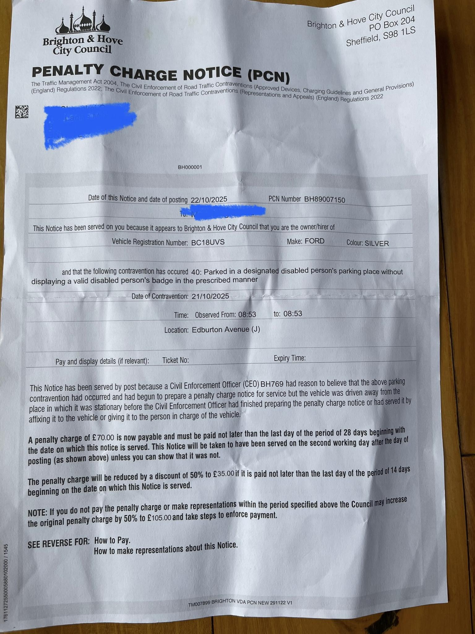 PCN BY BRIGHTON COUNCIL FOR PARKING/stopping? IN DISABLED BAY