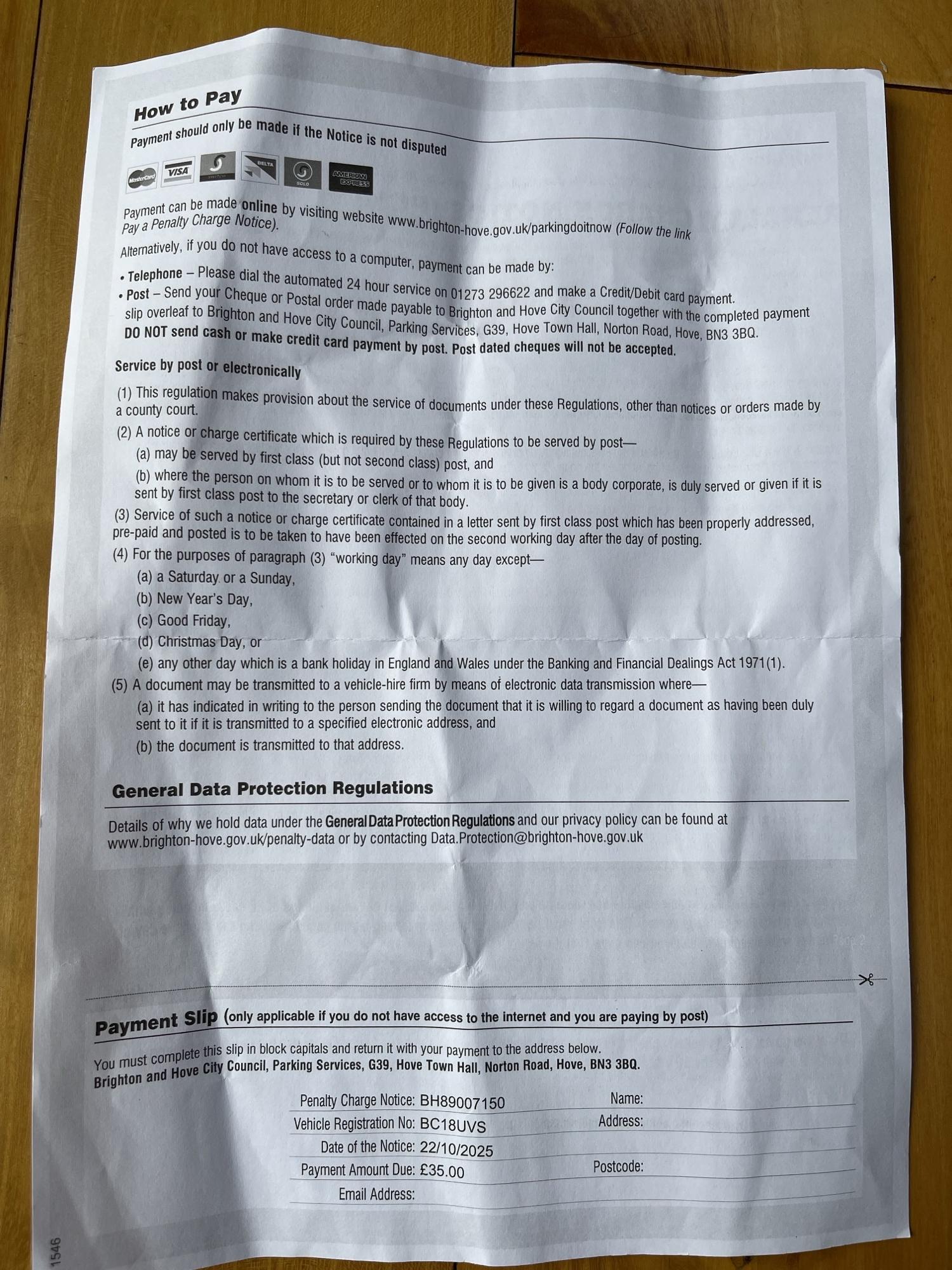 Re: PCN BY BRIGHTON COUNCIL FOR PARKING/stopping? IN DISABLED BAY