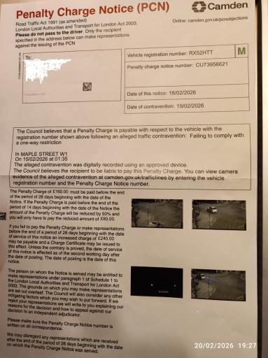 Re: PCN-Camden-Failing to comply with a one-way restriction