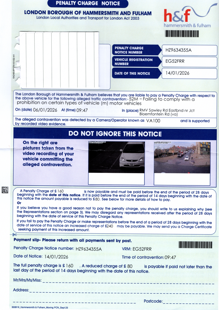 Author Topic: PCN Hammersmith and Fulham - 52M - Failing to comply with a prohibition Sawley Road/Bloemfontein Road  (Read 48 times)