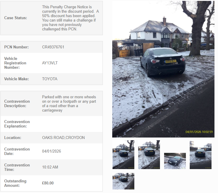 On 04/01/2026 I received a PCN from Croydon council on Oaks Road (CR0 5HL), for "Parked with one or more wheels on or over a footpath or any part of a road other than a carriageway" (See details here: