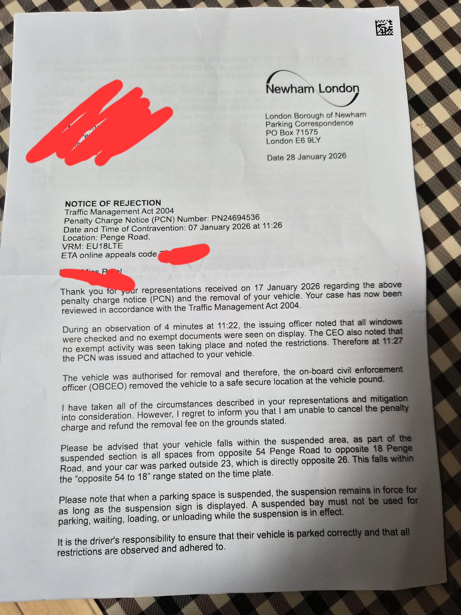 Author Topic: Newham, 01a, parked in a restricted street during prescribed hours (temporary traffic order)  (Read 419 times)