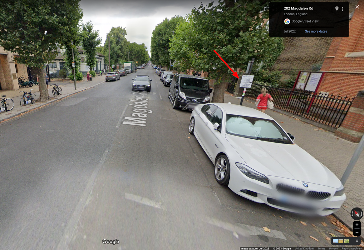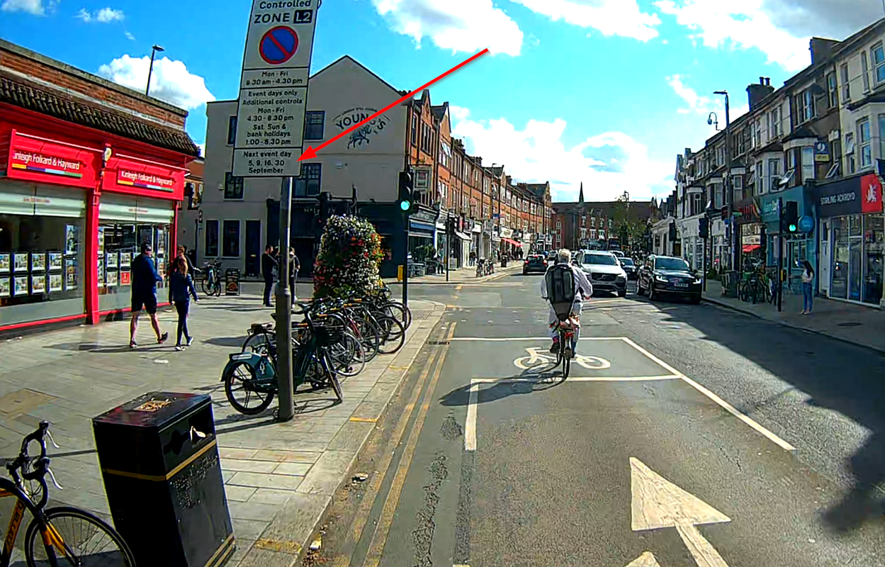 4) I later learnt from your website that the sign should have been located outside Earlsfield station as Weybourne street is in the L2 zone. Why did you place a sign about 600 metres away, outside a busy station? A motorist parking there should be expected… to do what, exactly? To leave the car there, check on your website where the sign should be, walk circa 1.2 kilometres (what if they have little kids?) during which time they can still be fined by an overzealous parking warden, to check the sign outside a train station? Or maybe drive there to check the sign, but, wait, it’s rightly impossible to park next to the train station, so should they maybe block the traffic till they locate and read the entire sign? Not to mention the sign is only visible driving southbound, so someone driving from Weybourne street would need to drive north beyond the sign, then do a u-turn to head back south! I cycled past that sign and have recorded footage with a dashcam: it contains 12 lines of text; it can be read ONLY by a motorist who knows where it is AND who happens to be stationary at a red light – there is NO realistic way to read it safely and properly otherwise. If every motorist stopped to read it, on an A road outside a train station, it would be chaos.