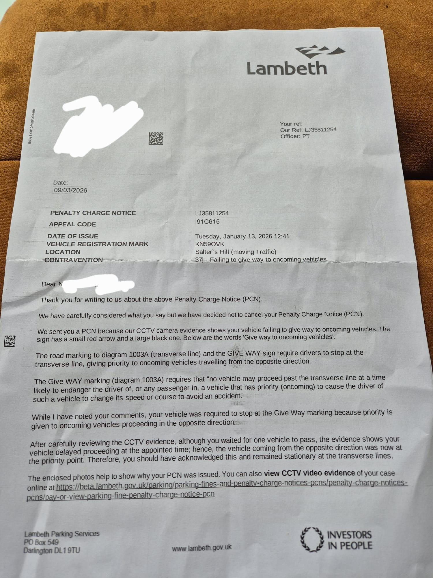 Their letter is total and utter tosh ! (no surprise there, and it does show why Lambeth are such a useless stupid council). There is no legal requirement whatsoever, to stop at the give-way line. But if a vehicle is approaching, such that proceeding would force the other vehicle to slow down or stop, the driver should stop at the give-way line.