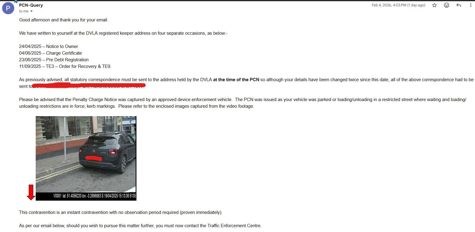 After they provided me with the PCN number I then contacted WPPP, via email to get some more insight as to what this fine was allegedly for, they provided me with a breakdown and an image as evidence and said the following: