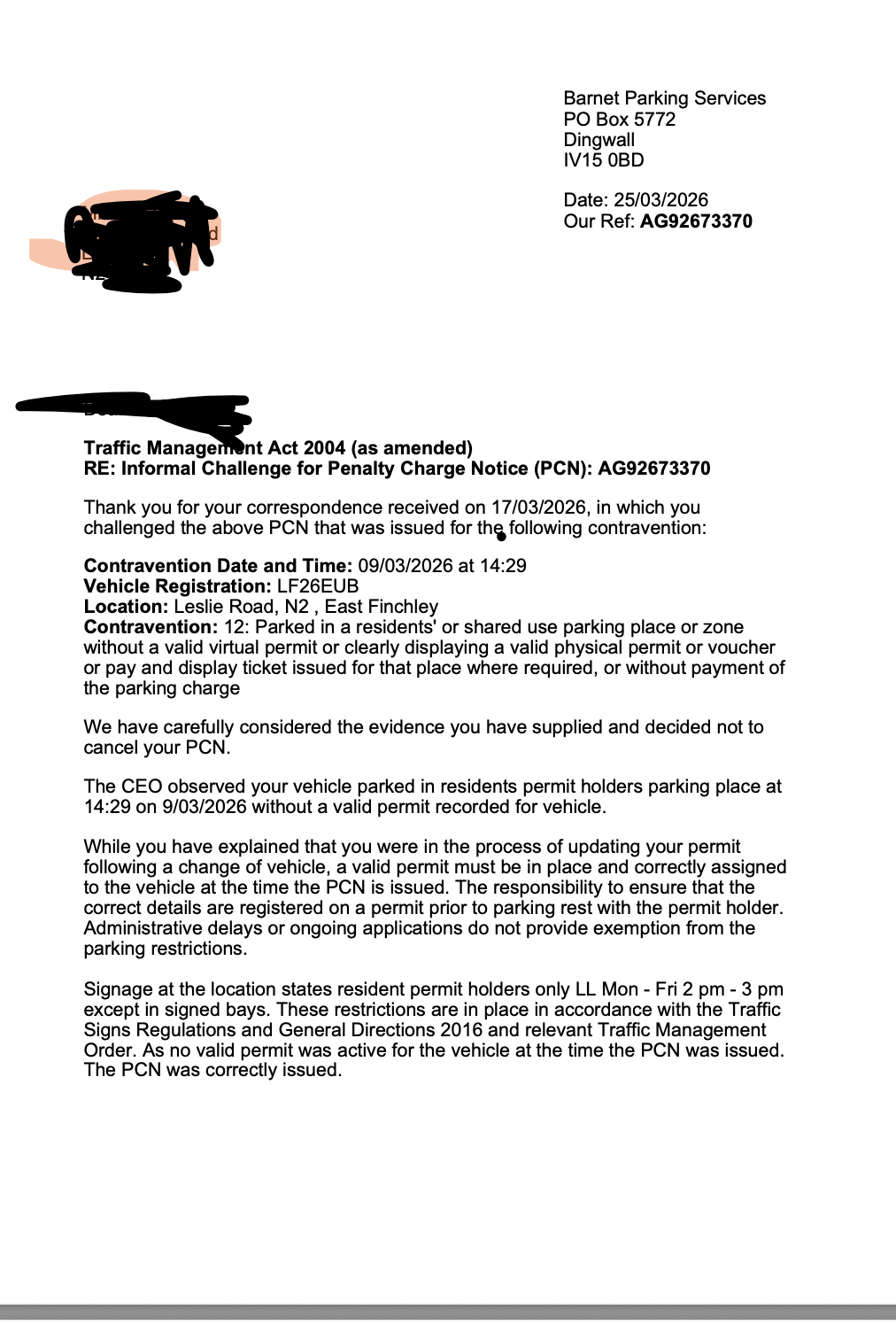 Given that I was a legitimate permit holder and was actively attempting to update the permit for my new vehicle, I already respcutlly requested that Barnet Council cancell the PCN.