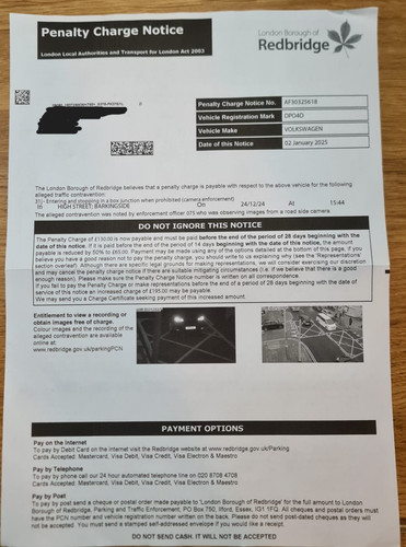 Author Topic: Redbridge PCN - 31j - Entering and stopping in a yellow box junction when prohibited (camera enforcement)  (Read 665 times)