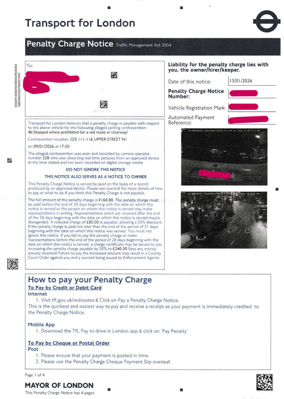 I was parked on a red route on Upper Street, London N1. The ticket puts my car there at 17:50 (correct), with a very blurry image.