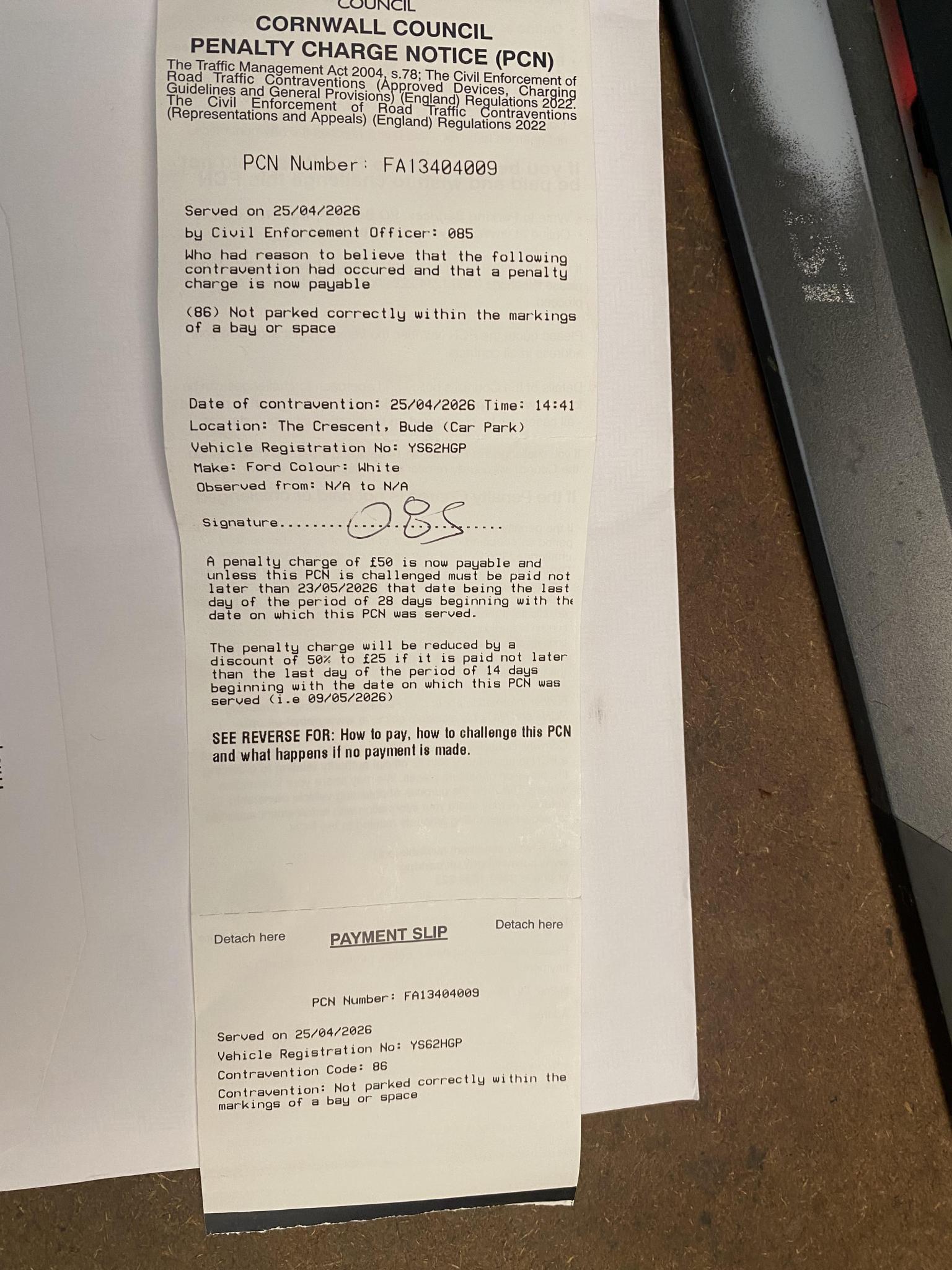 Author Topic: Cornwall, Contravention Code 86 Not parked correctly, The Crescent Bude, FA13404009  (Read 45 times)