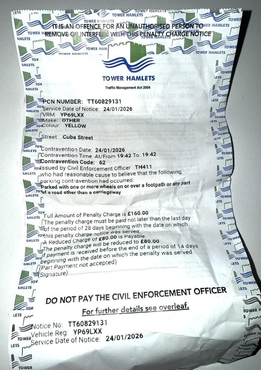Re: Tower Hamlets | Code 62 parked on footpath (motorcycle) | Cuba Street