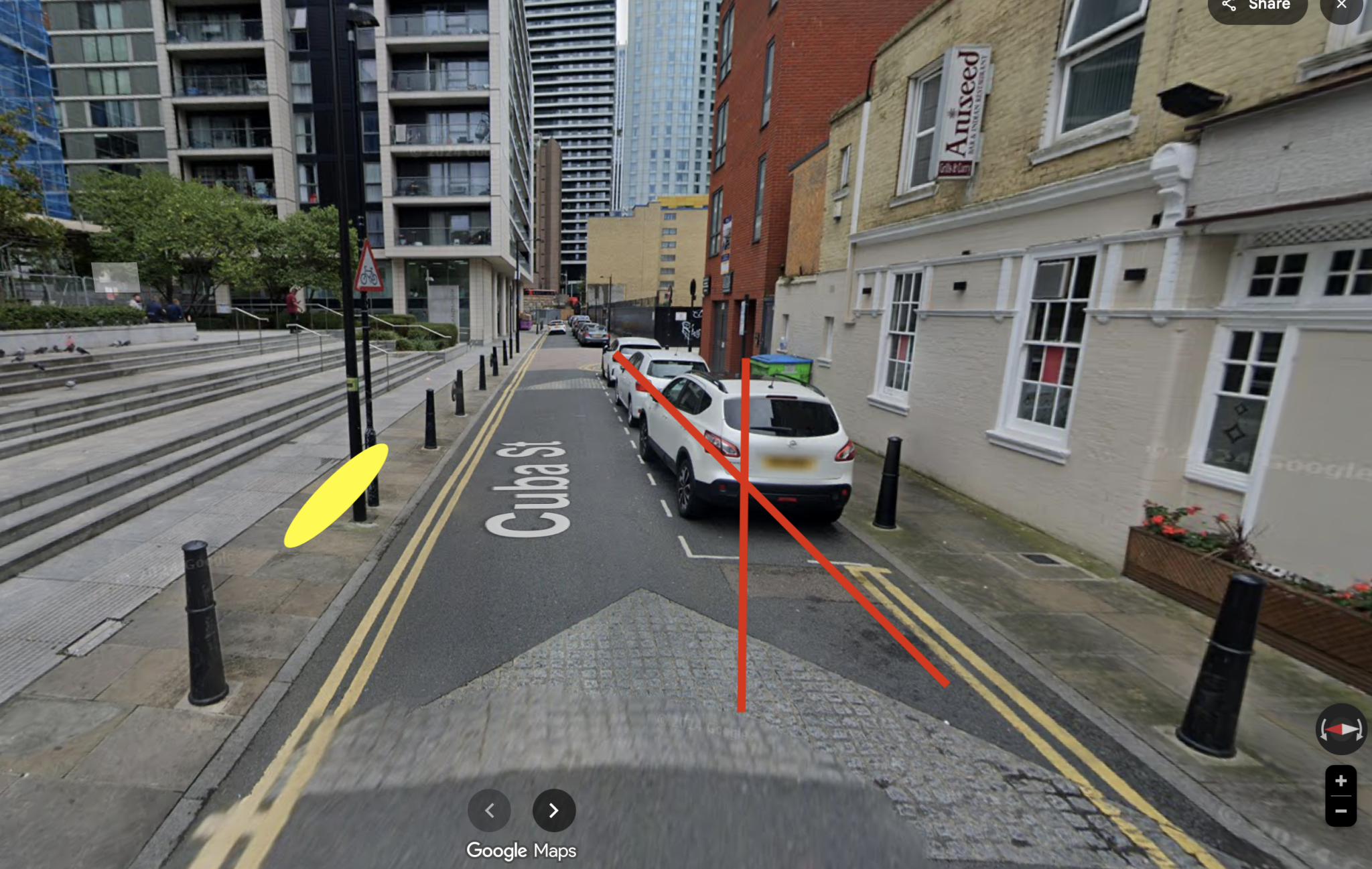 Yellow: where I parked (not obstructing pedestrians), red X section was filled with other cars.