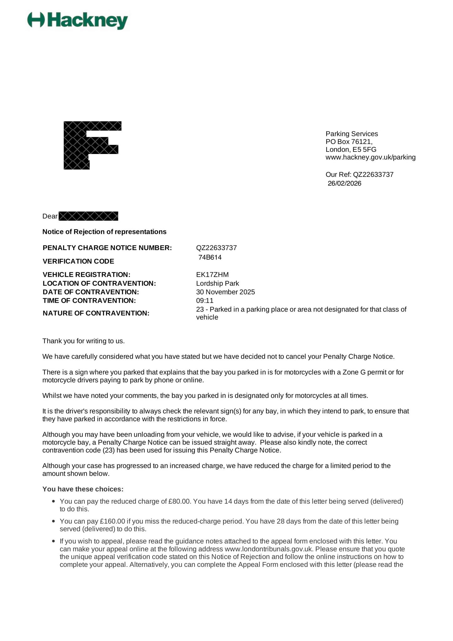 Also, your reps were an informal challenge against the paper PCN, and all London councils game the system ruthlessly and reject virtually all informal reps knowing that most people then just cough-up to get the discount. I call them "Fob Off" letters. So if you are prepared to stand your ground, you must wait for the Notice to Owner, sent to the name and address on the V5C for the vehicle. So, is this your vehicle, and is the V5C Registration Certificate up-to-date ?