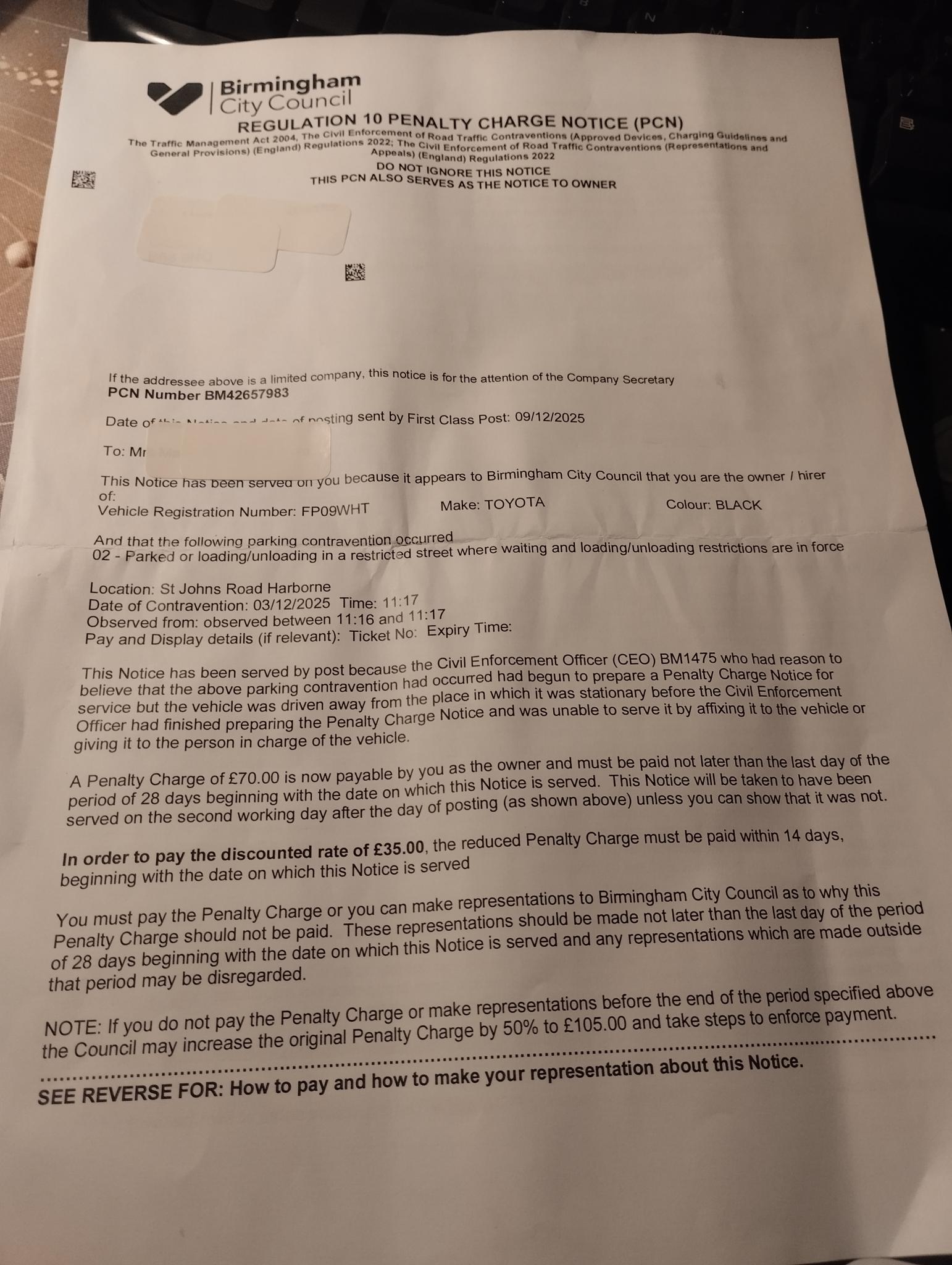 Well it seems clear that the council have acted correctly in issuing a Reg.10 after your driveaway. You have only two possible avenues of approach to representations, (1) mitigation - your wife in A & E, your short time parked etc or (2) put the council to the test that a PCN was in course of being prepared when you drove off.
