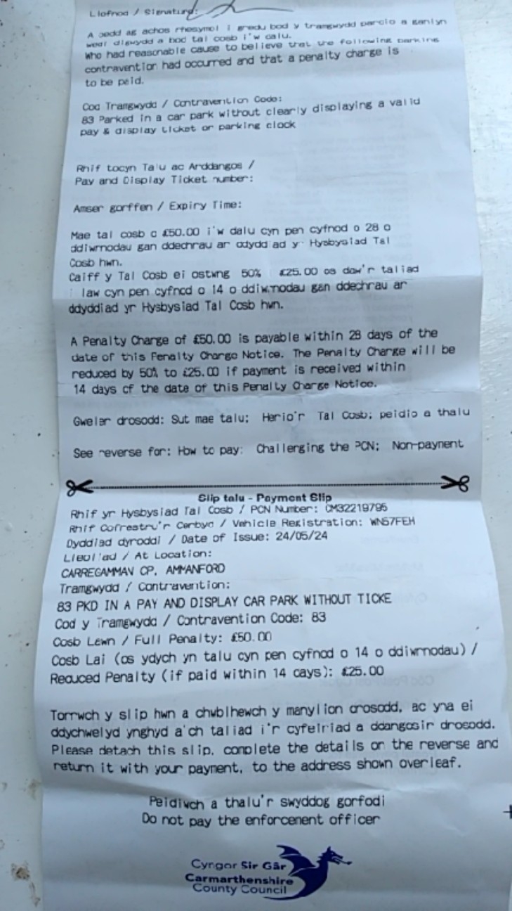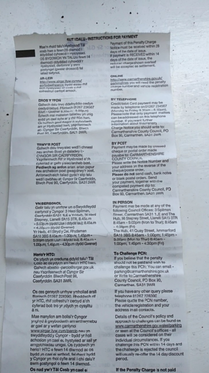 Adding to the confusion the parking ticket uses a different word for "permit": "hawlen".