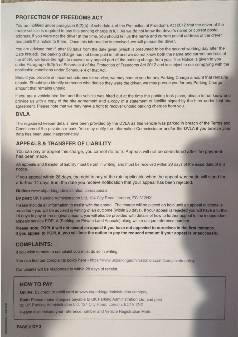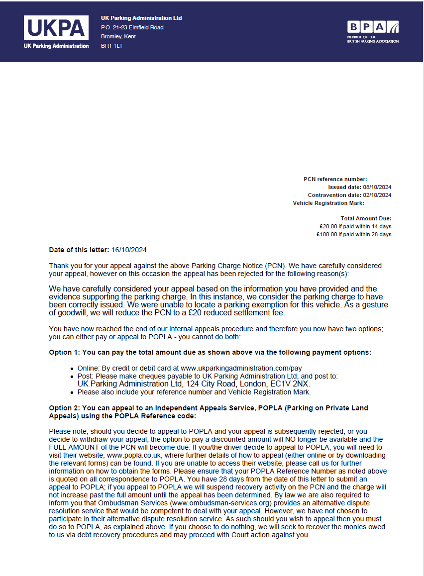 They responded to me offering me a reduction in the fee to £20.00 if paid within 14 days. Or I could go to POPLA.
