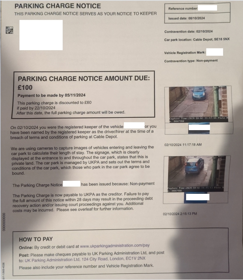 On 02/10/2024 I went to a private car parked managed by UK Parking Administration Ltd, Cable Depot SE18 5NX. I will post pictures of the signage tomorrow as I am due back in the area.