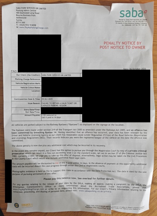 Private parking tickets / Re: Penalty Notice from Saba for not paying for parking