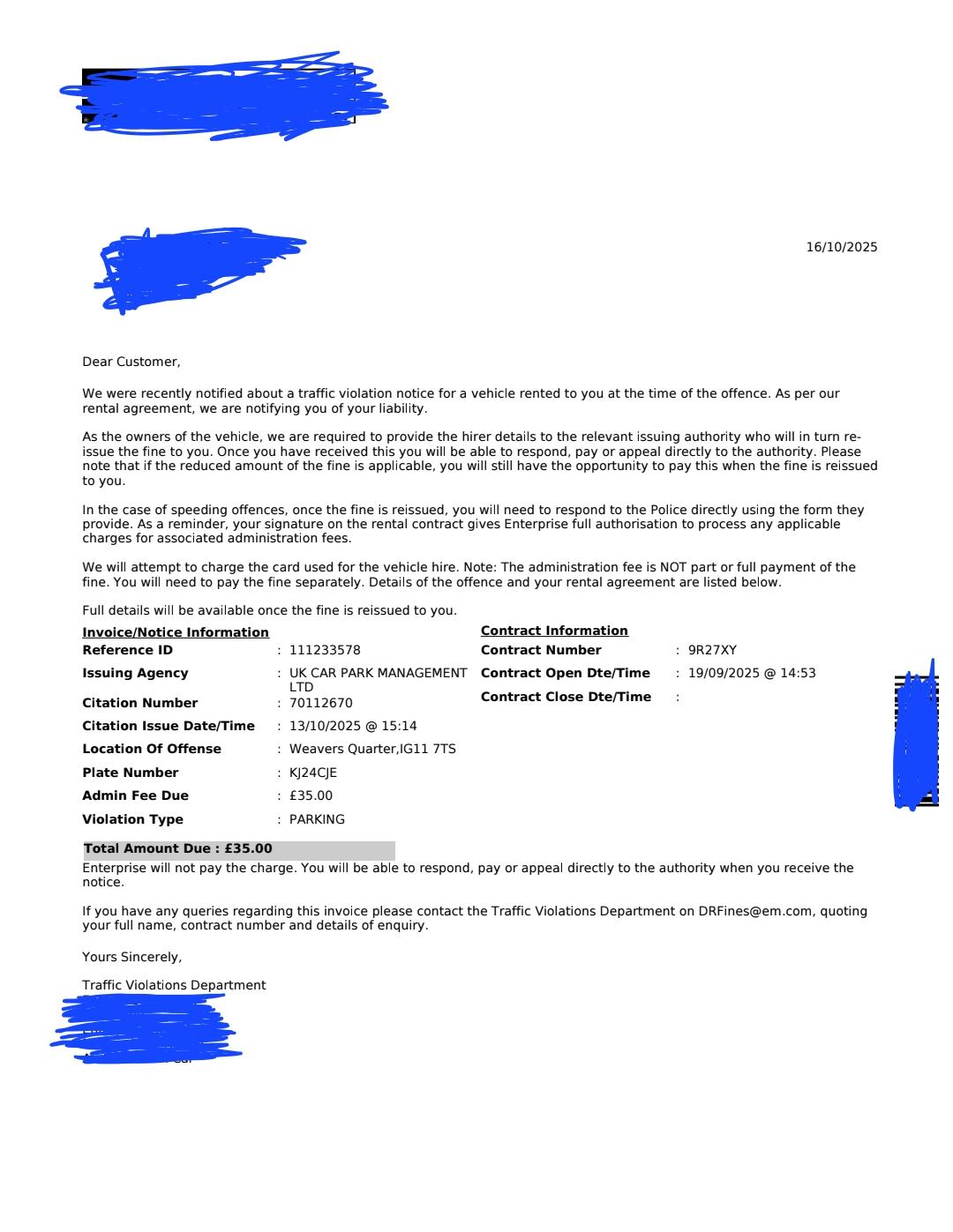 Hi Jfollows, thank you for your response, I really appreciate your willingness to help.Excuse my ignorance but I am not sure exactly what you mean by this.The only correspondence I recieved prior to this was an email which stated the following:"Dear Customer,Please find attached details of a traffic violation received during a recent rental. Please review the documents attached, which will provide all of the information you need.*Please do not reply to this email address as it is not monitored*Yours Sincerely..."In addition, the email contained an attachment which I have included in this response.Would this constitute the requirements you stated in your response?Many thanks.