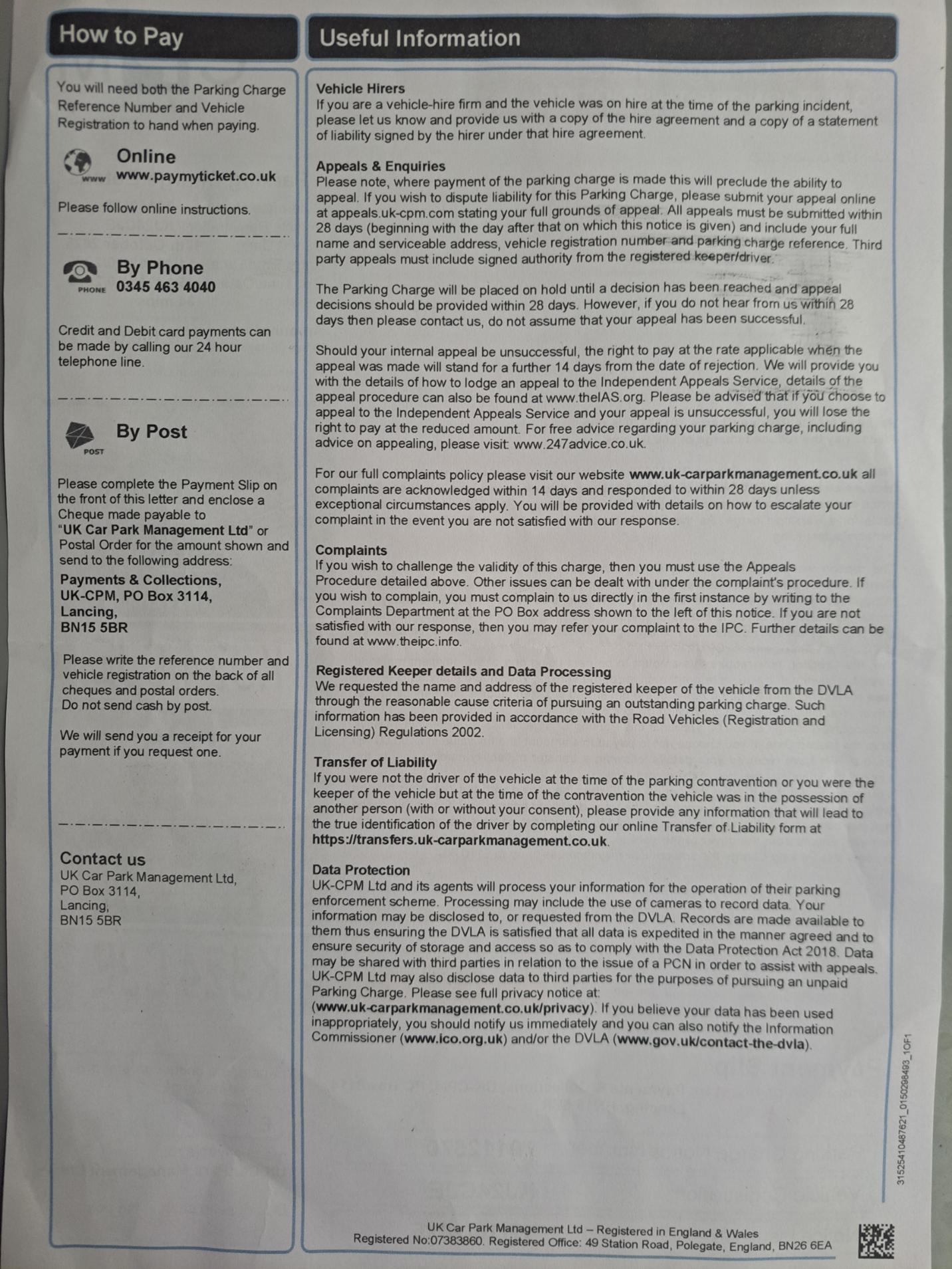 Hello, any advice on how to appeal this PCN received in the post today would be much appreciated. I will try to give as much information as possible. Thanks in advance.It was a courtesy car from a major brand, who notified me via email three days prior that I had been issued a PCN from CPM. They also informed that I am liable for a £35 admin fee, for passing my details as the hirer on to the company. However, upon reviewing the hiring company's T&Cs, if the PCN has been issued in error I am not liable to pay this. Therefore, if I can avoid paying this I will (hopefully) avoid the admin fee as well.I will be appealing this and fighting to the bitter end for the reasons listed below. Am I correct in using these points to appeal and will they hold up or should I use a different approach?