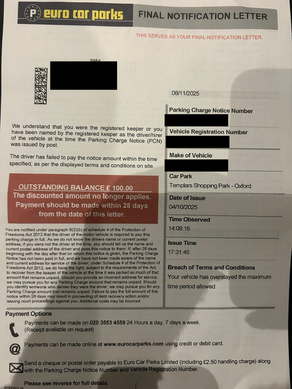 Private parking tickets / Re: Euro Car Parks PCN – Overstay – Templars Shopping Centre Oxford
