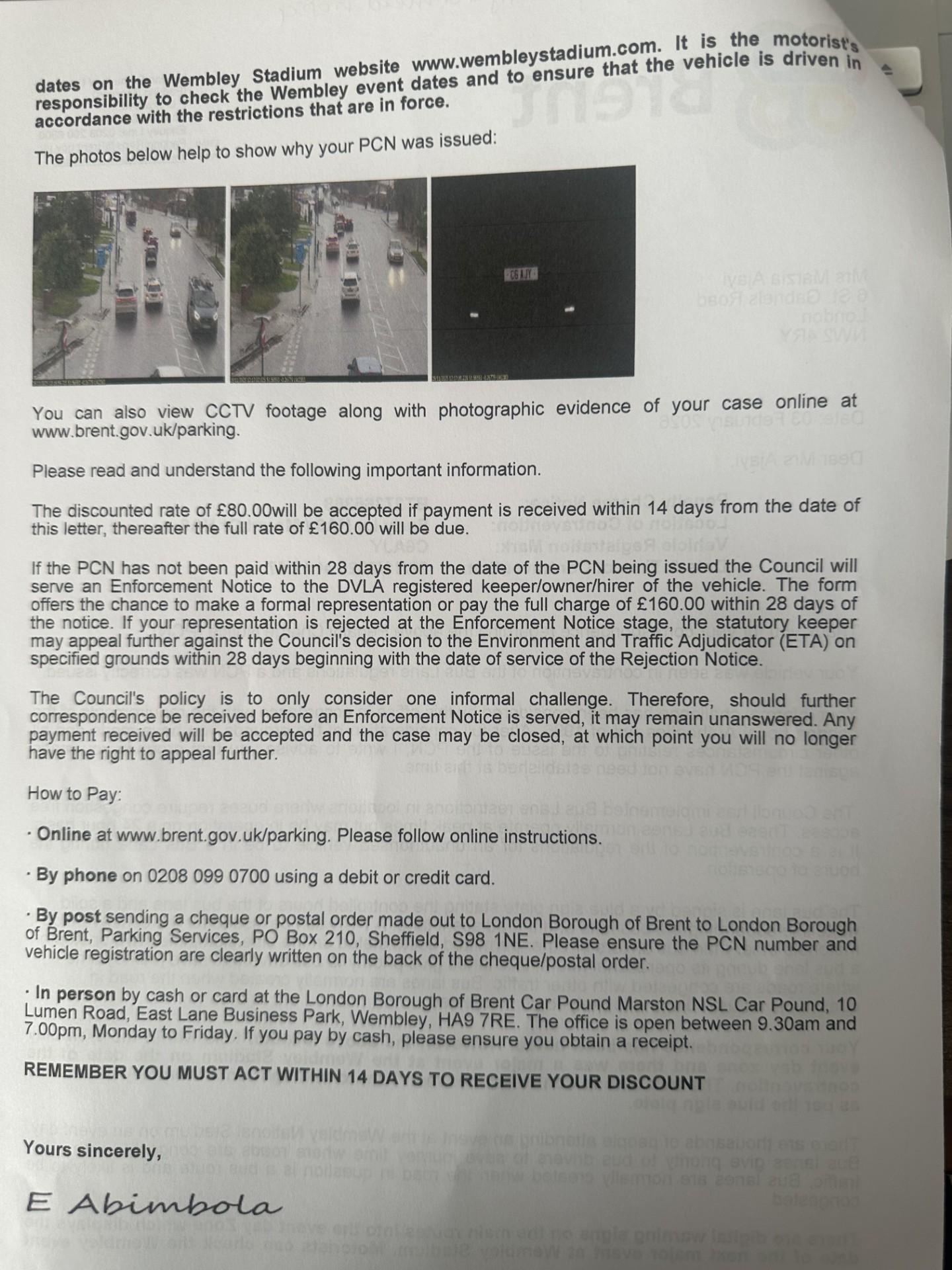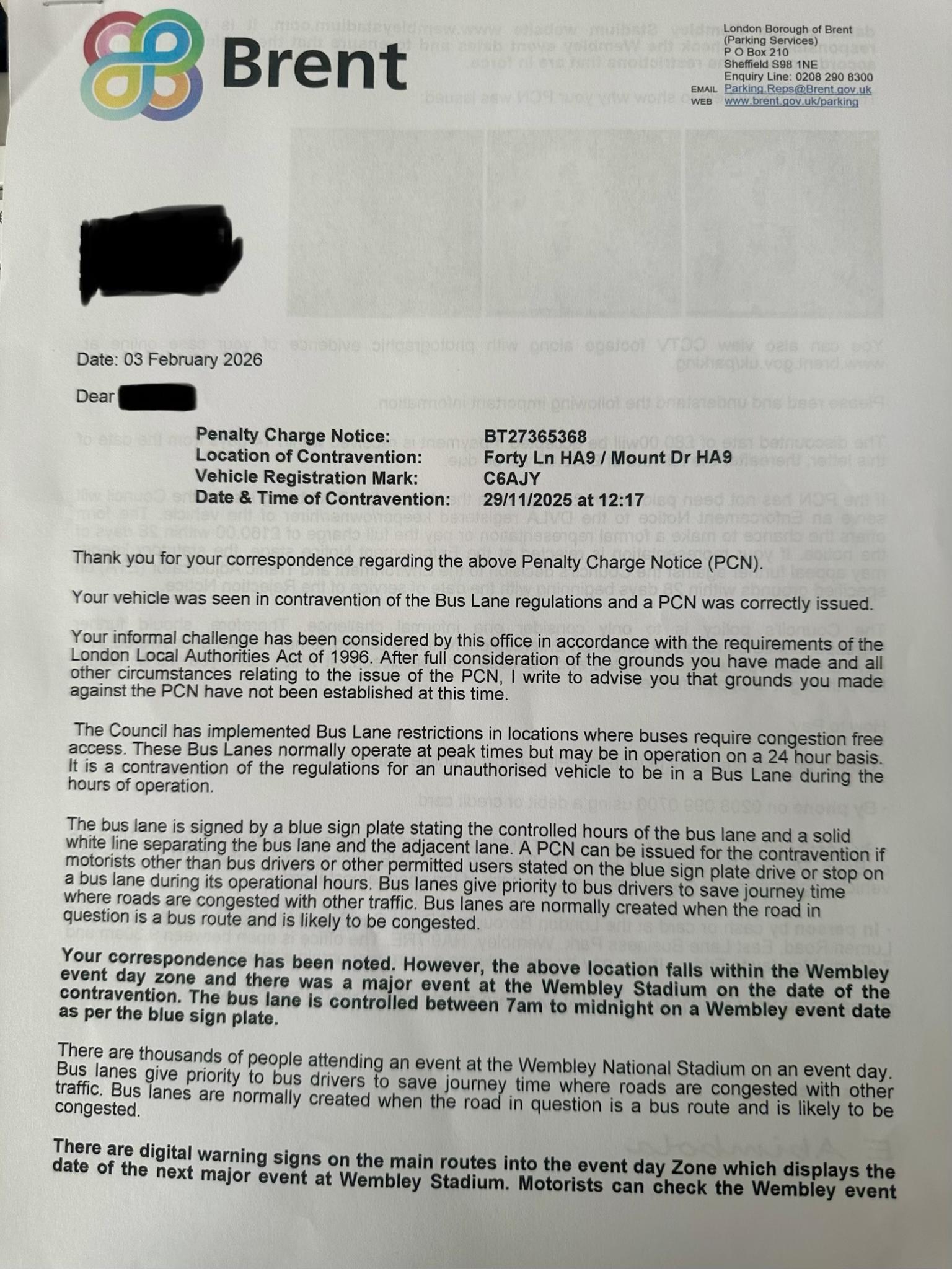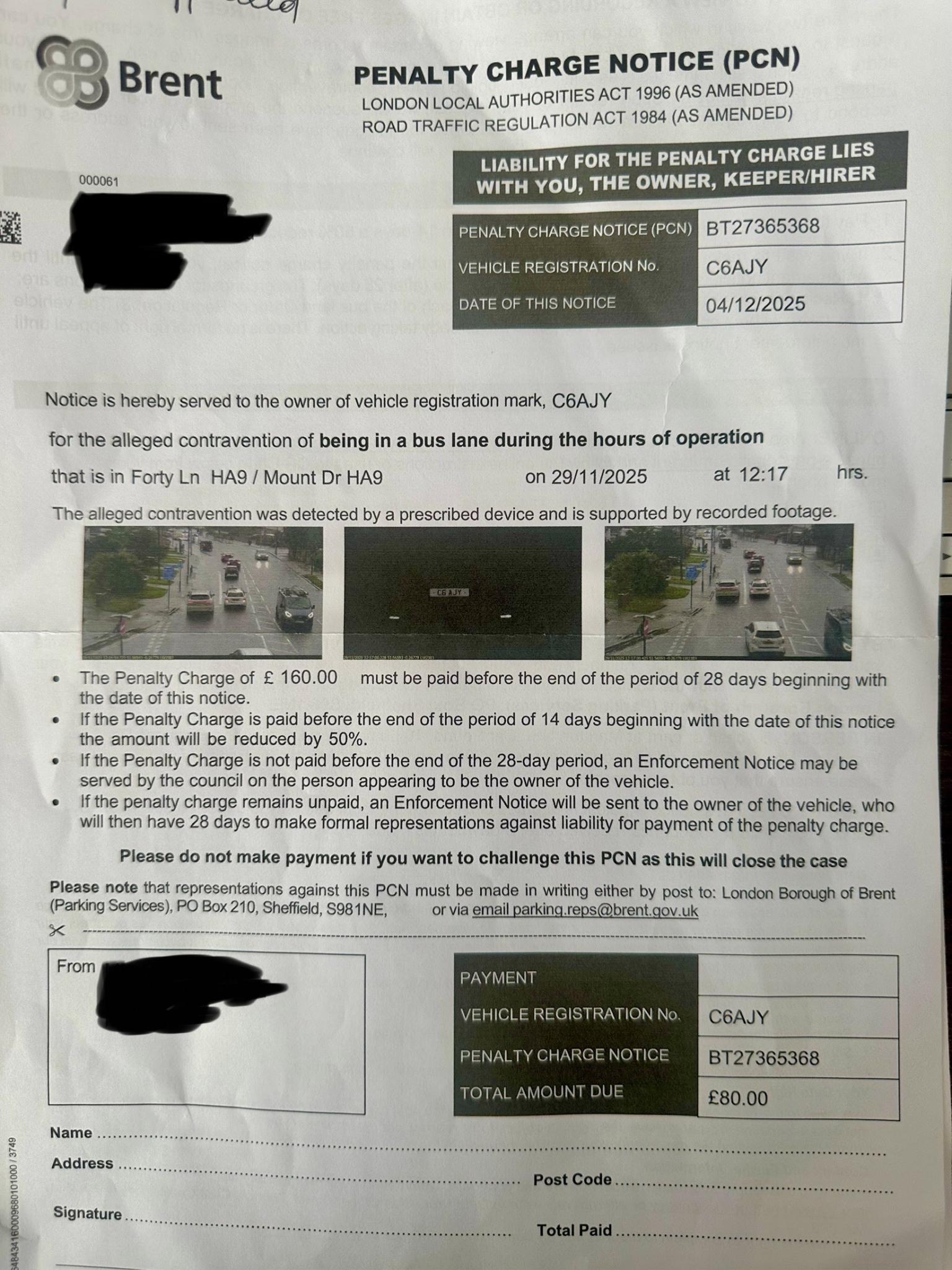 Civil penalty charge notices (Councils, TFL and so on) / Re: Brent - 49J Parked wholly or partly on a cycle track CCTV enf. Walm Lane NW2