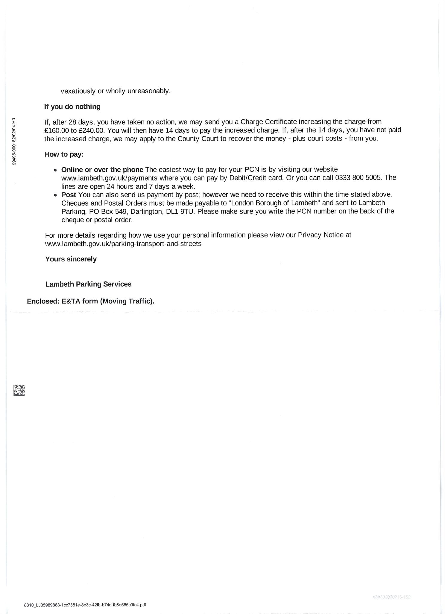 If the penalty charge is not paid before the end of the 28-day period, a Charge Certificate may be served increasing the charge by 50% to £240.00.