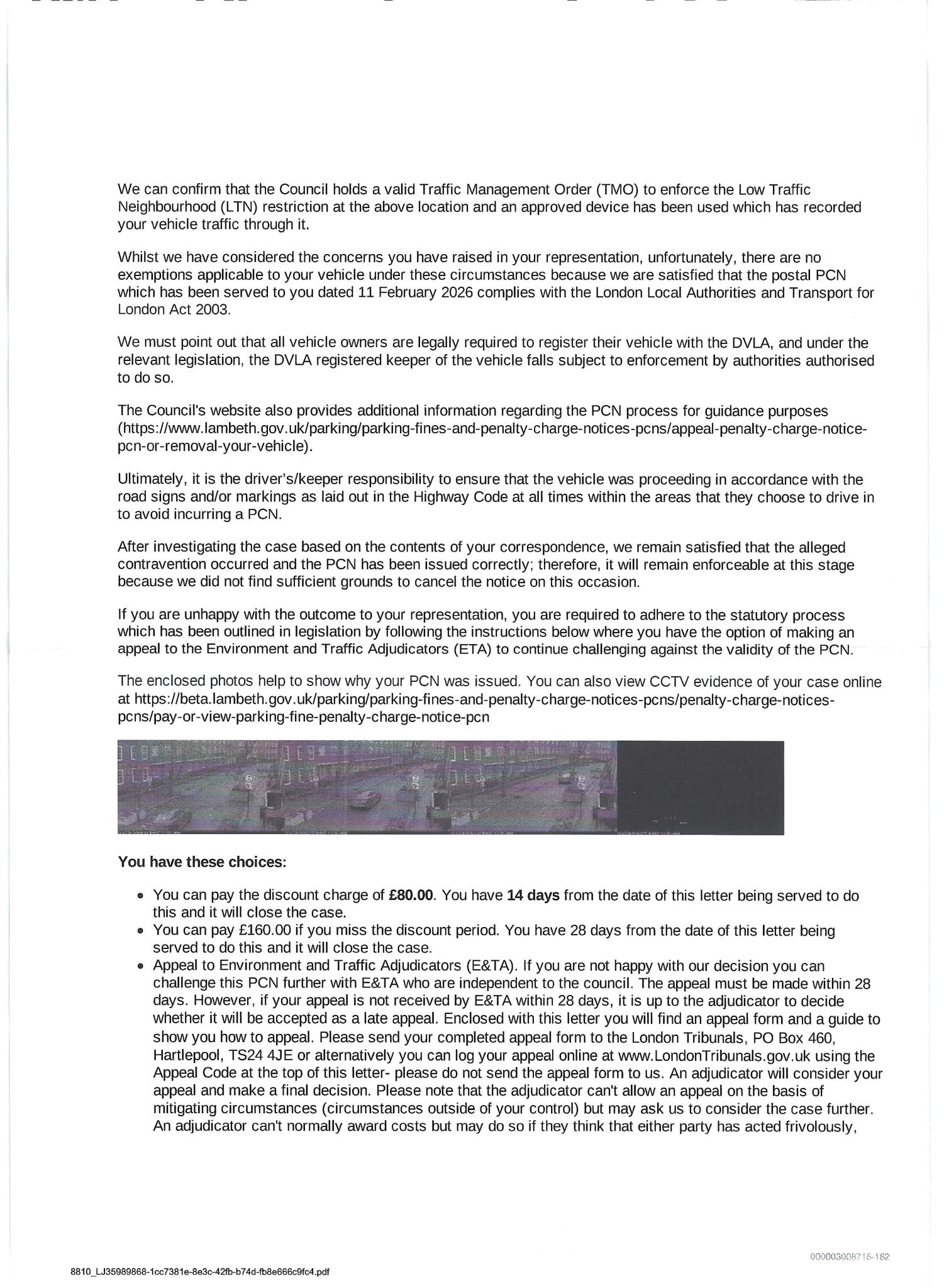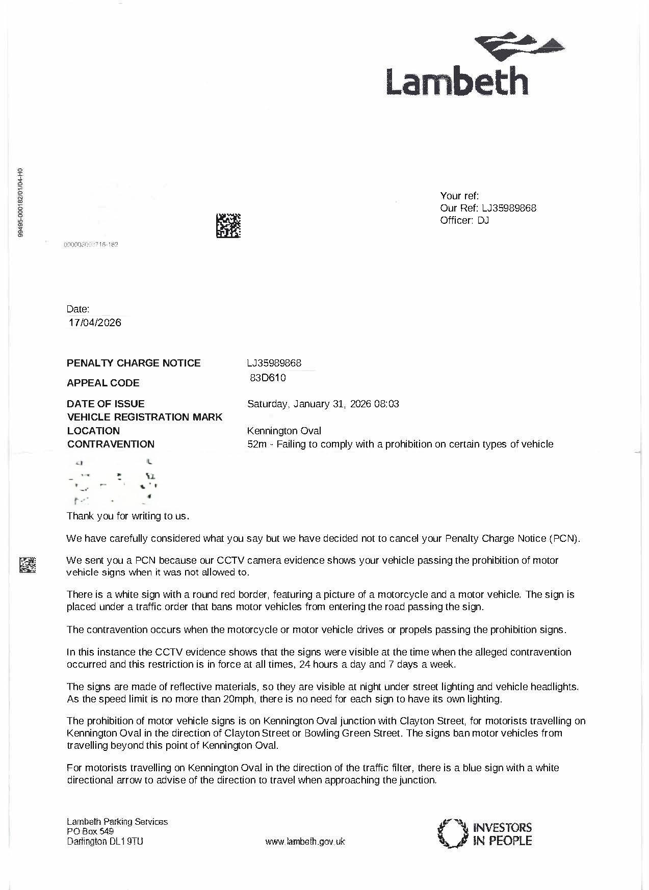 https://www.ftla.uk/civil-penalty-charge-notices-(councils-tfl-and-so-on)/lambeth-code-52m-no-motor-vehicles-kennington-oval/) in regards with the same contravention and in that topic it mentioned the below: