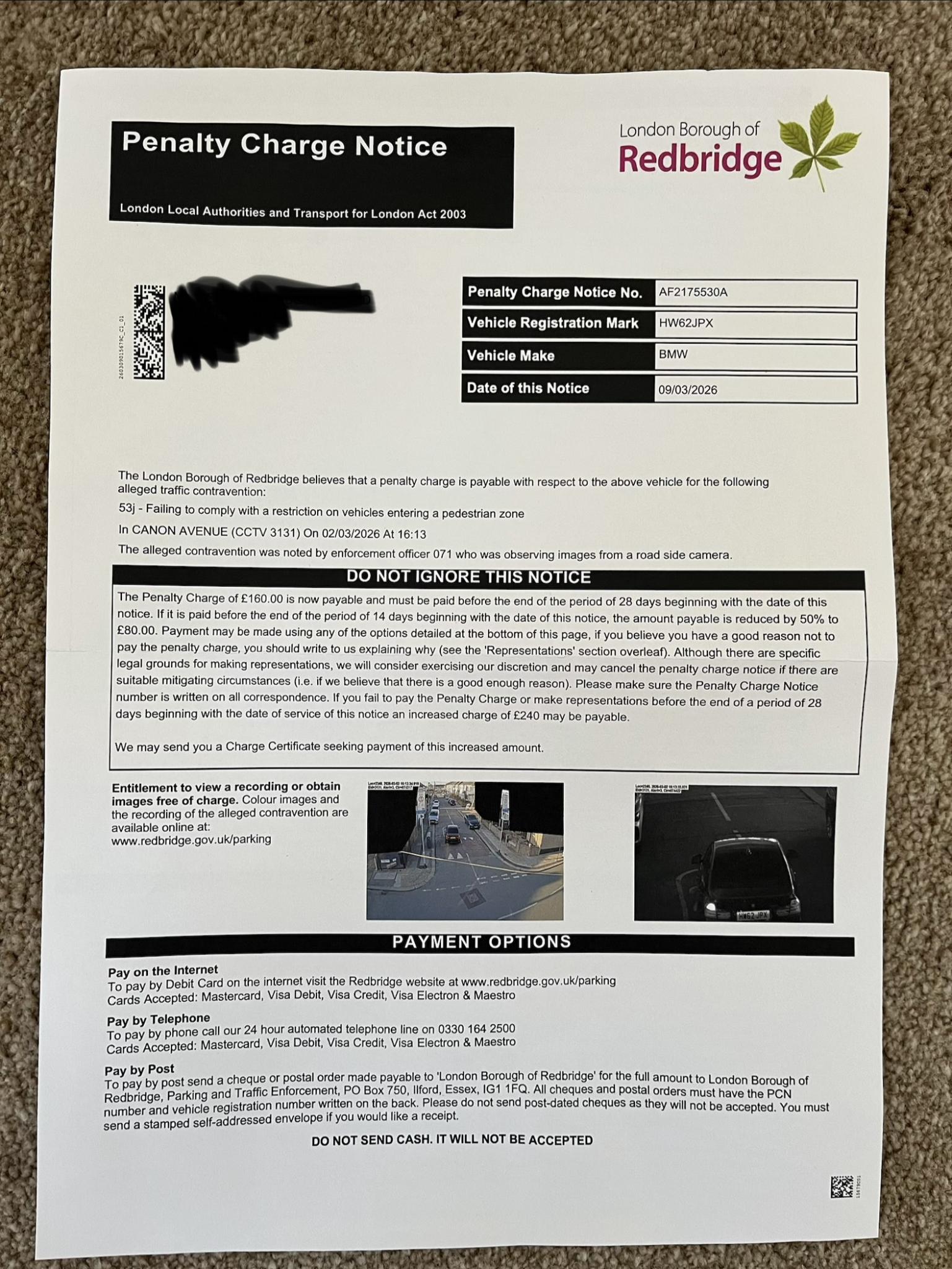 Civil penalty charge notices (Councils, TFL and so on) / Redbridge, code 53j entering a pedestrian zone, Canon Avenue