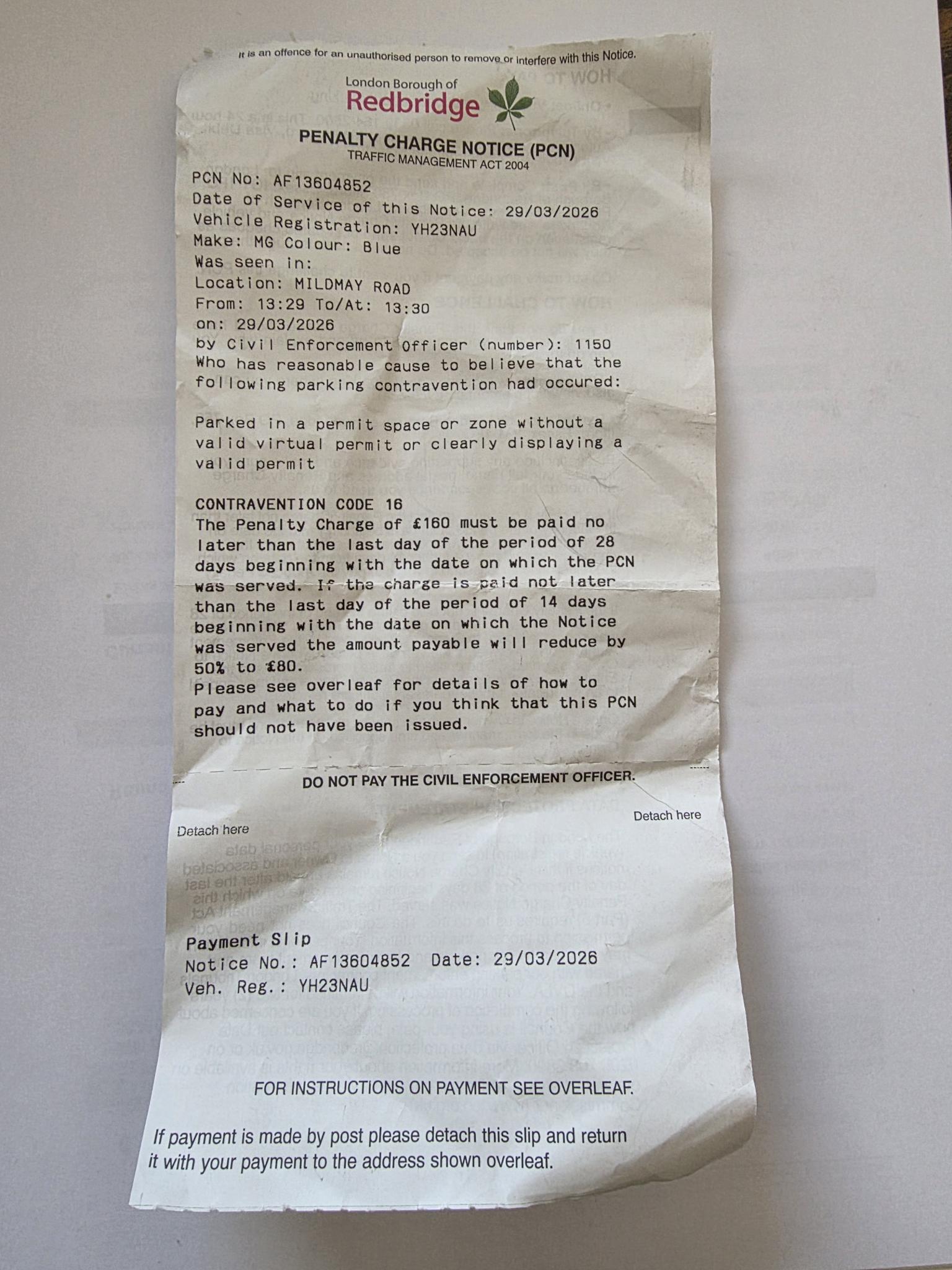 Civil penalty charge notices (Councils, TFL and so on) / Re: PCN - Mildmay Road, Ilford - Redbridge - Parking without any road markings