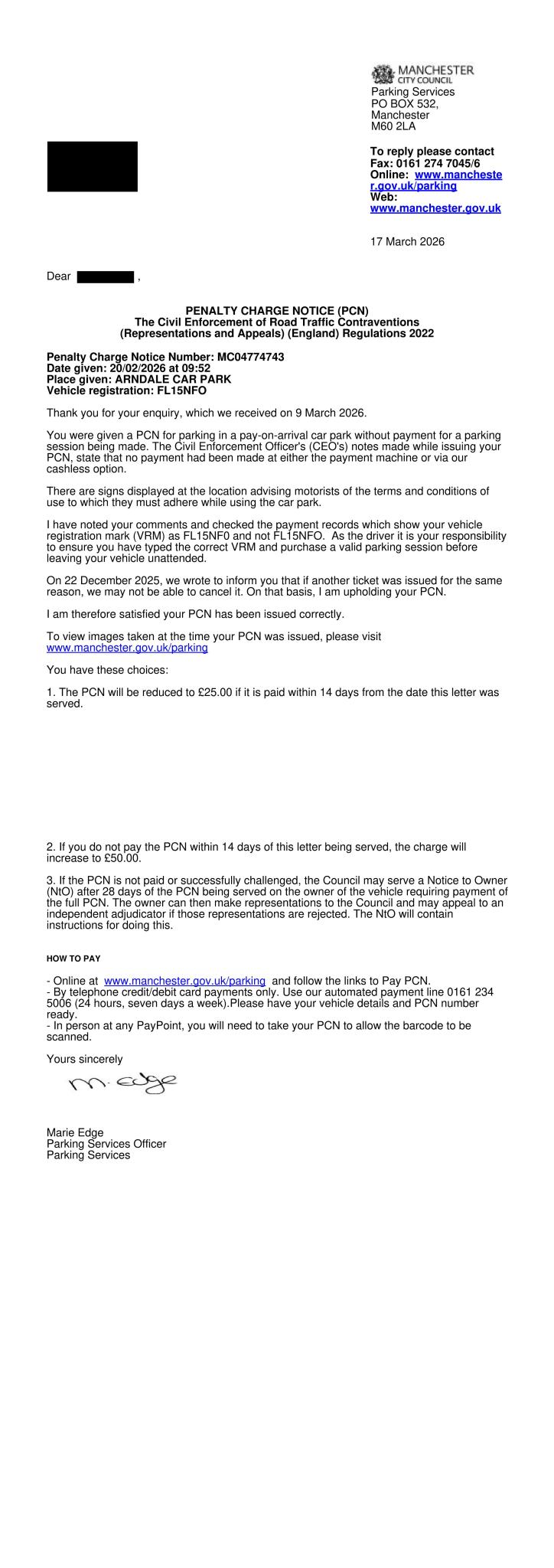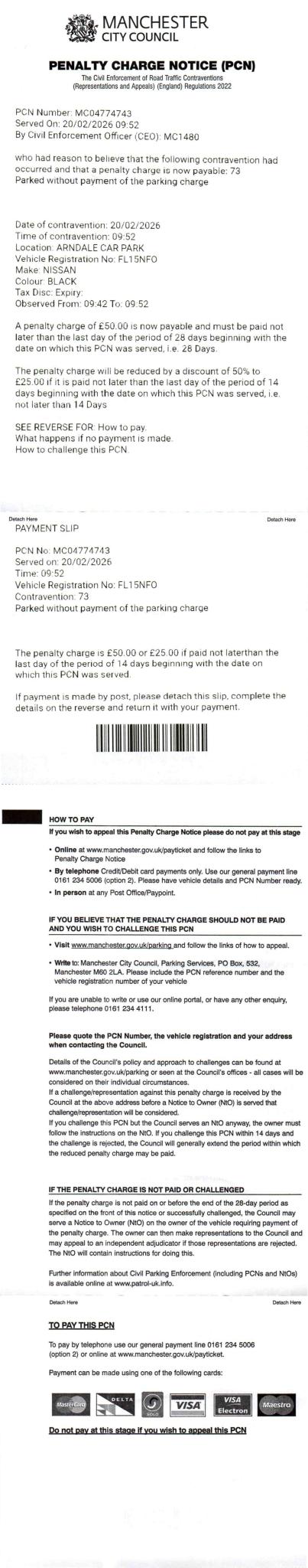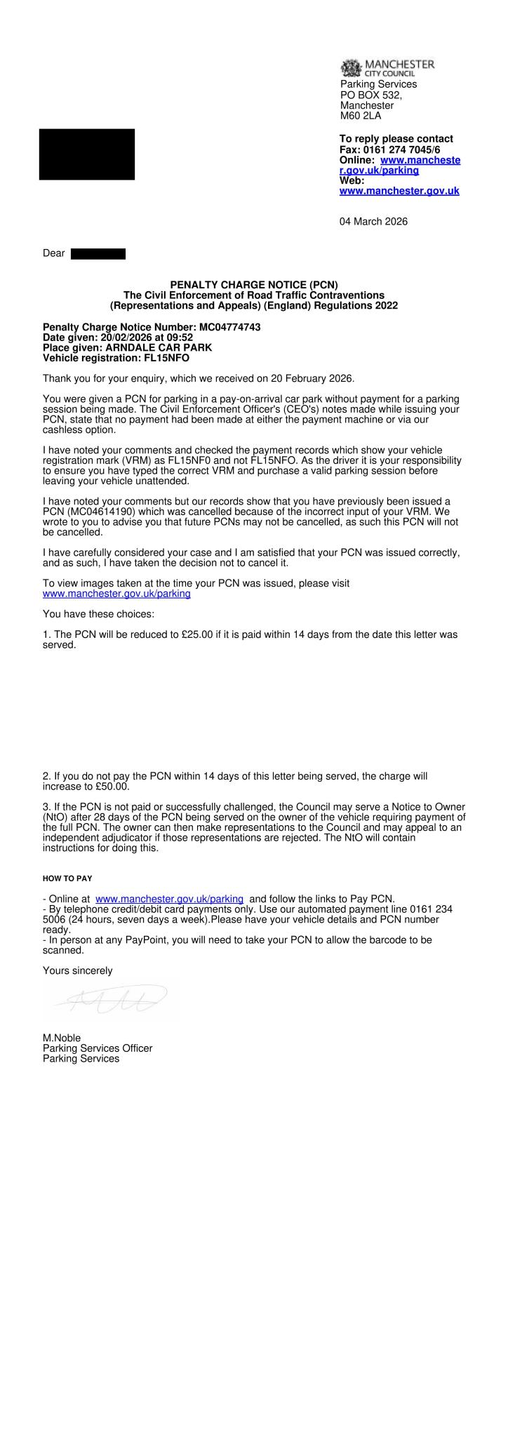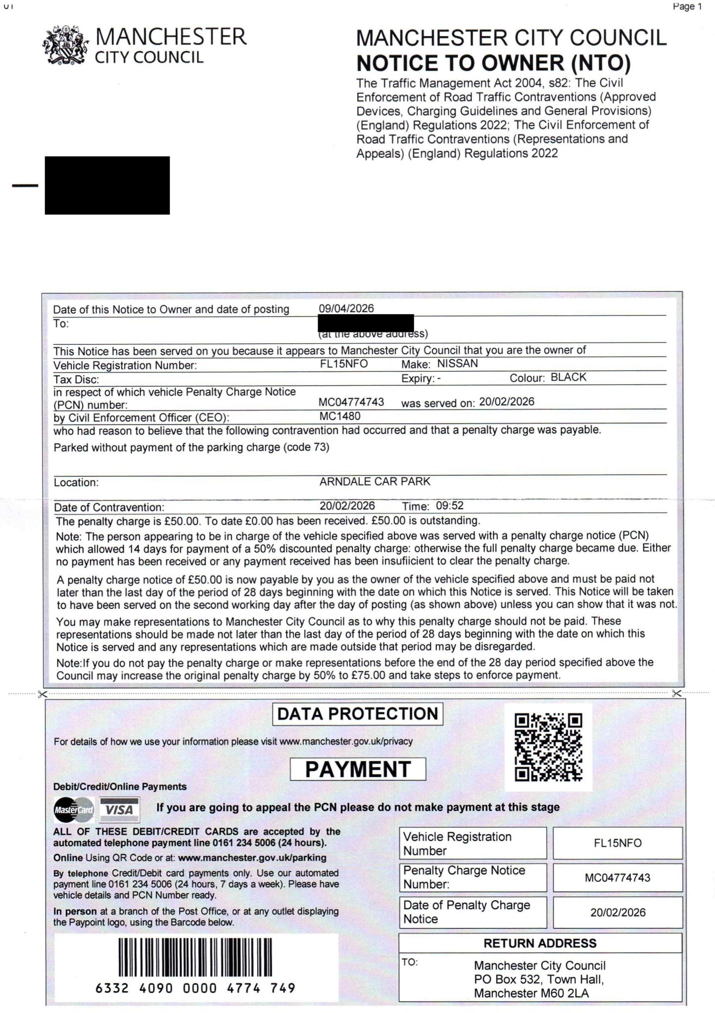 My wife received this as the keeper of the car for an alleged contravention on 20/02/2026 (MC04774743). The last digit of the reg was entered as a 0 instead of an O. She had previously received a PCN for the same issue on 10/12/2025 (MC04614190) and it was cancelled after an informal appeal with the council's response stating,