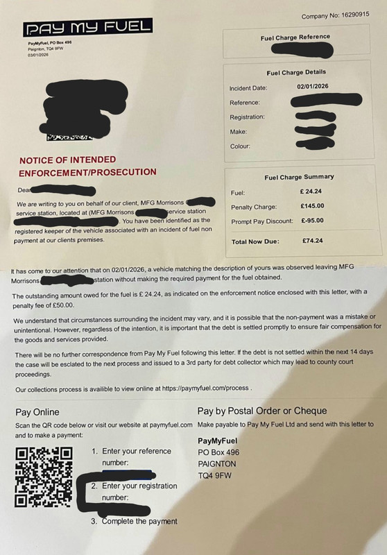 On Friday 9th I received a letter from Pay My Fuel informing me that I did not pay for my fuel at my local Morrison's service station.