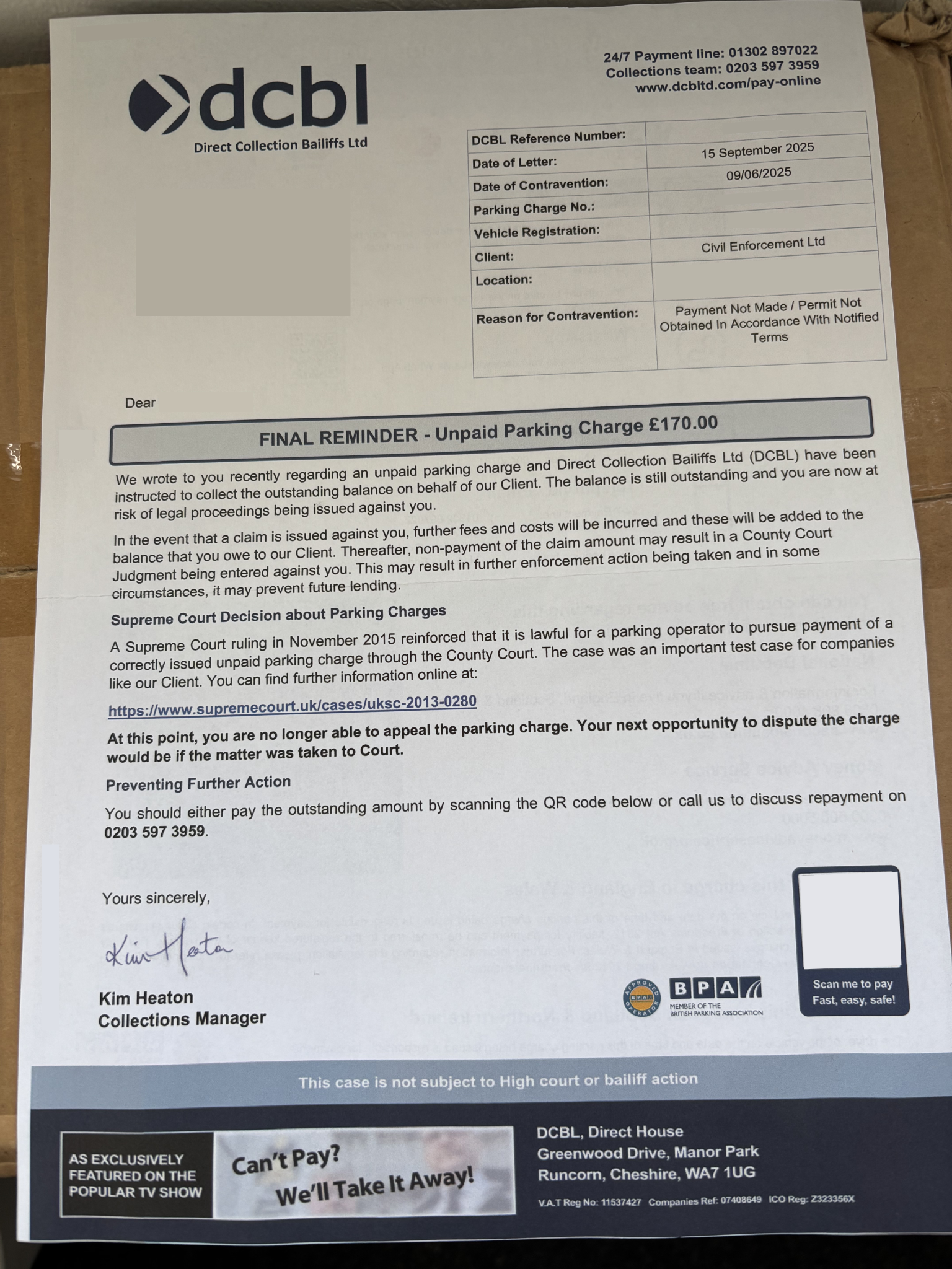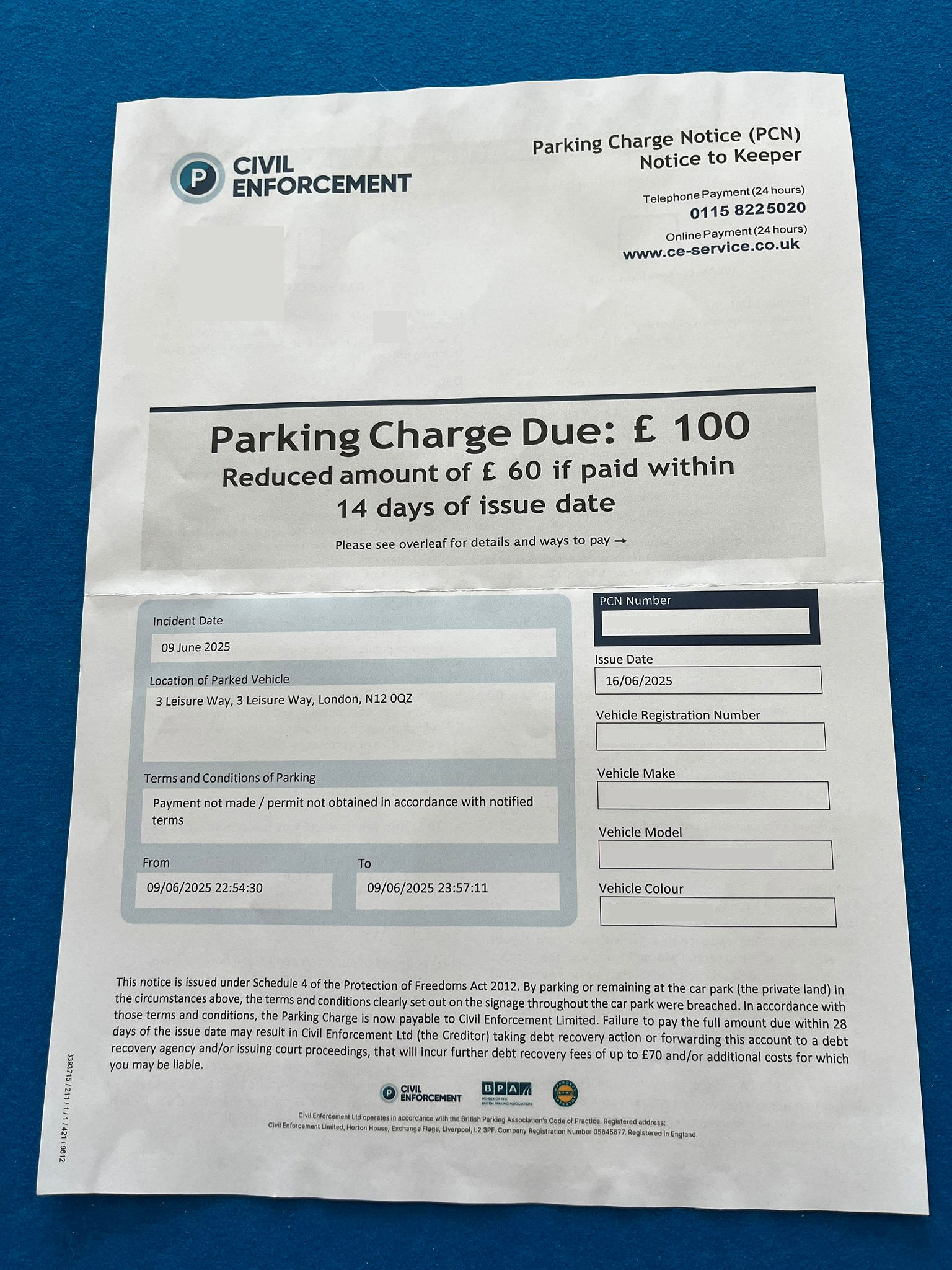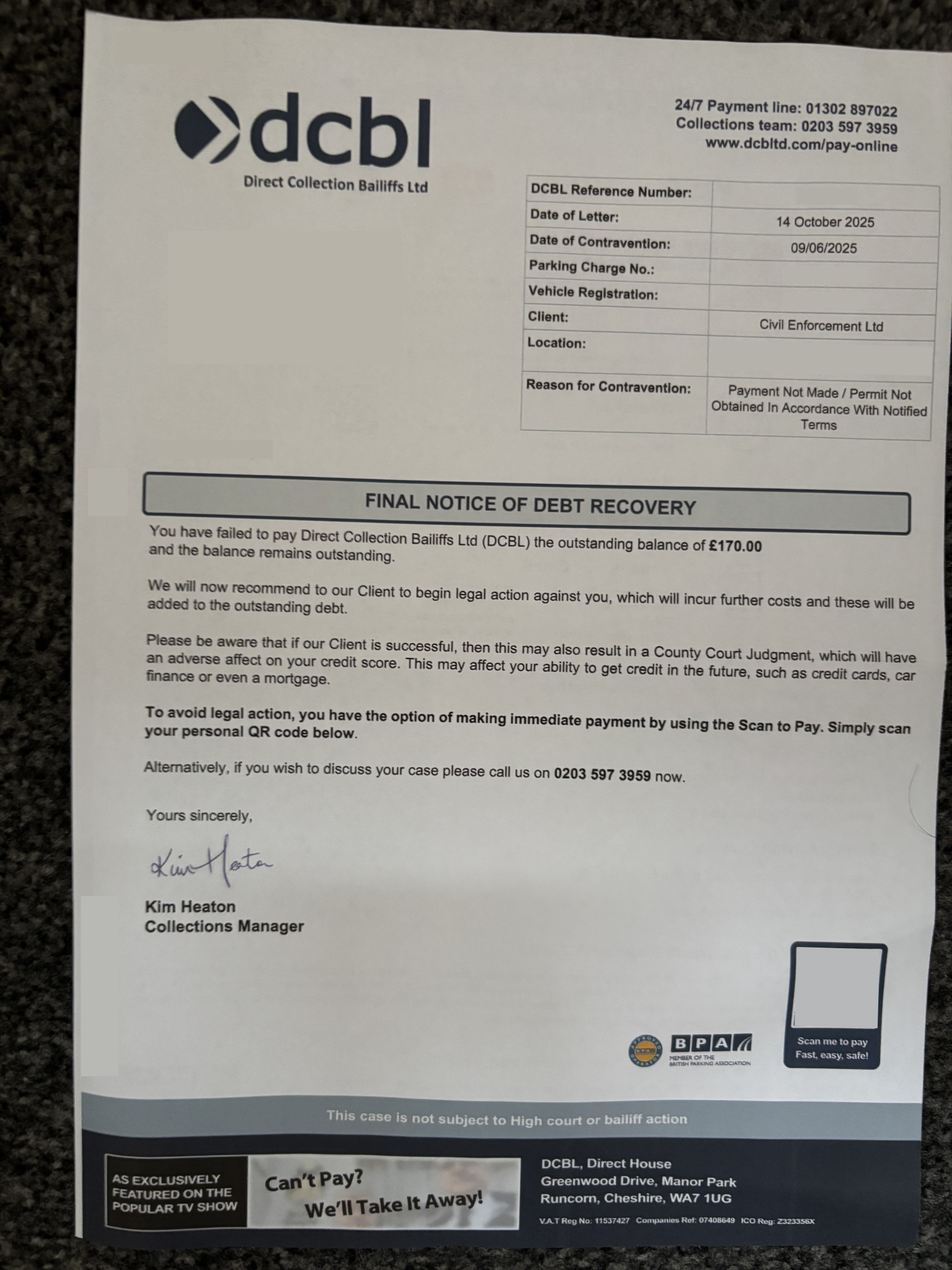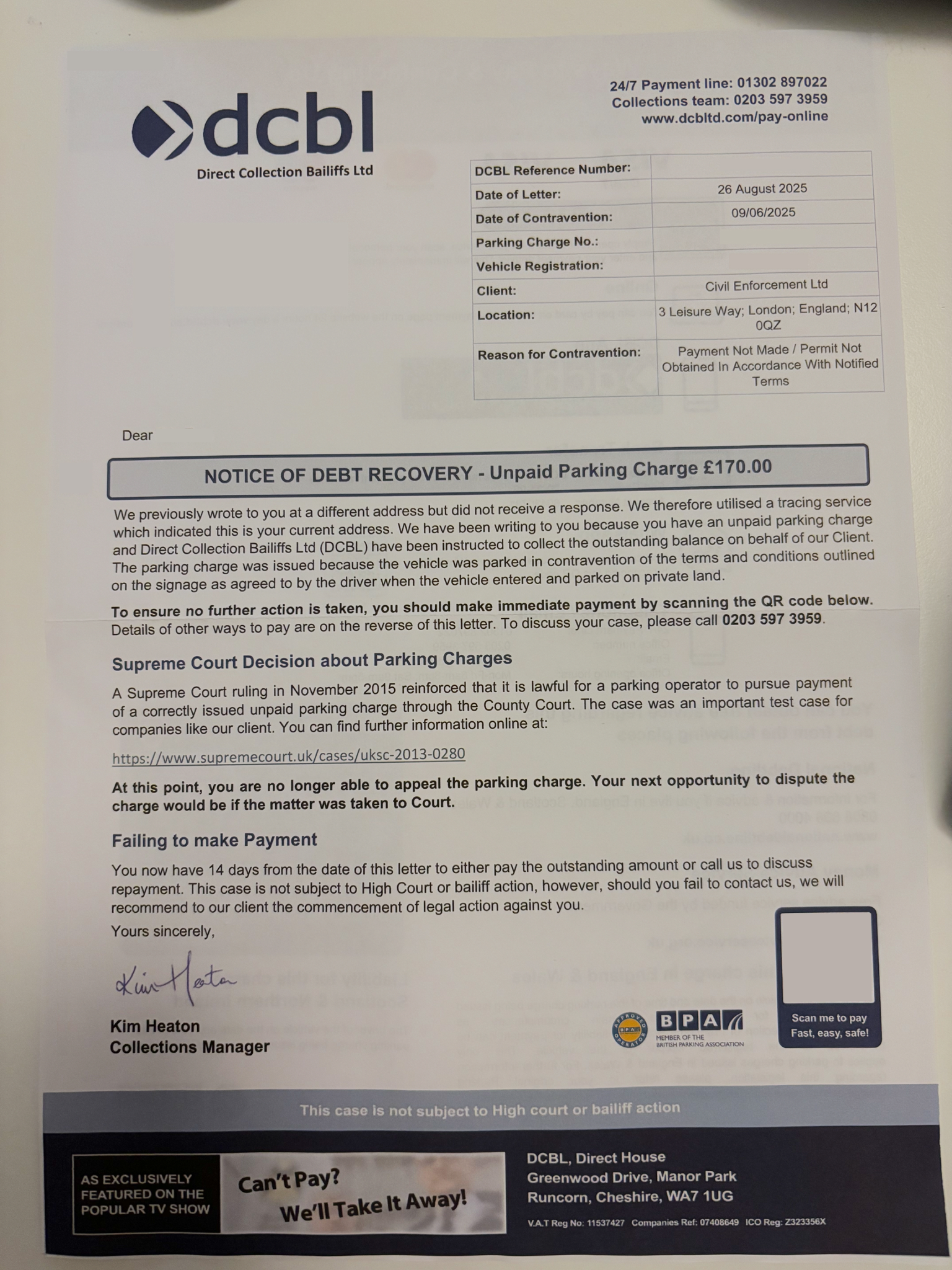 I have received a Notice of Debt Recovery from dcbl relating to a Parking Charge Notice issued by Civil Enforcement Ltd. I only received the letter yesterday (06/09/25) despite the letter being dated to 26/08/25.